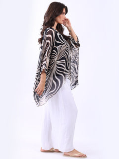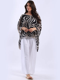 Crafted in Italy by Fashion Boutique, this elegant silk top is designed for women who value both comfort and style. Ideal for plus-size figures, it features a flattering lagenlook silhouette that drapes gracefully on all body types. This luxurious tunic showcases a bold swirl print, batwing sleeves, a bay neckline, and a relaxed fit. The double-layer construction adds depth to the design while providing lightweight coverage. Pair it effortlessly with plain silk trousers or denim for a chic look, perfect for casual outings or stylish summer evenings.
