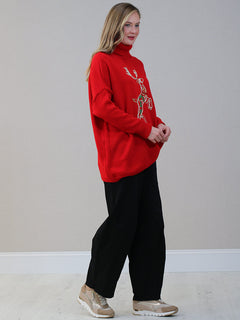 Your ideal travel buddy is this batwing knitted jumper! Its delicate shimmer and lovely reindeer design reflect festive fun. Its soft, warm knit and baggy fit will keep you cosy and fashionable whether your trip is to a holiday party or just embracing the season. This is the best choice to give your winter wardrobe some light-hearted flair.