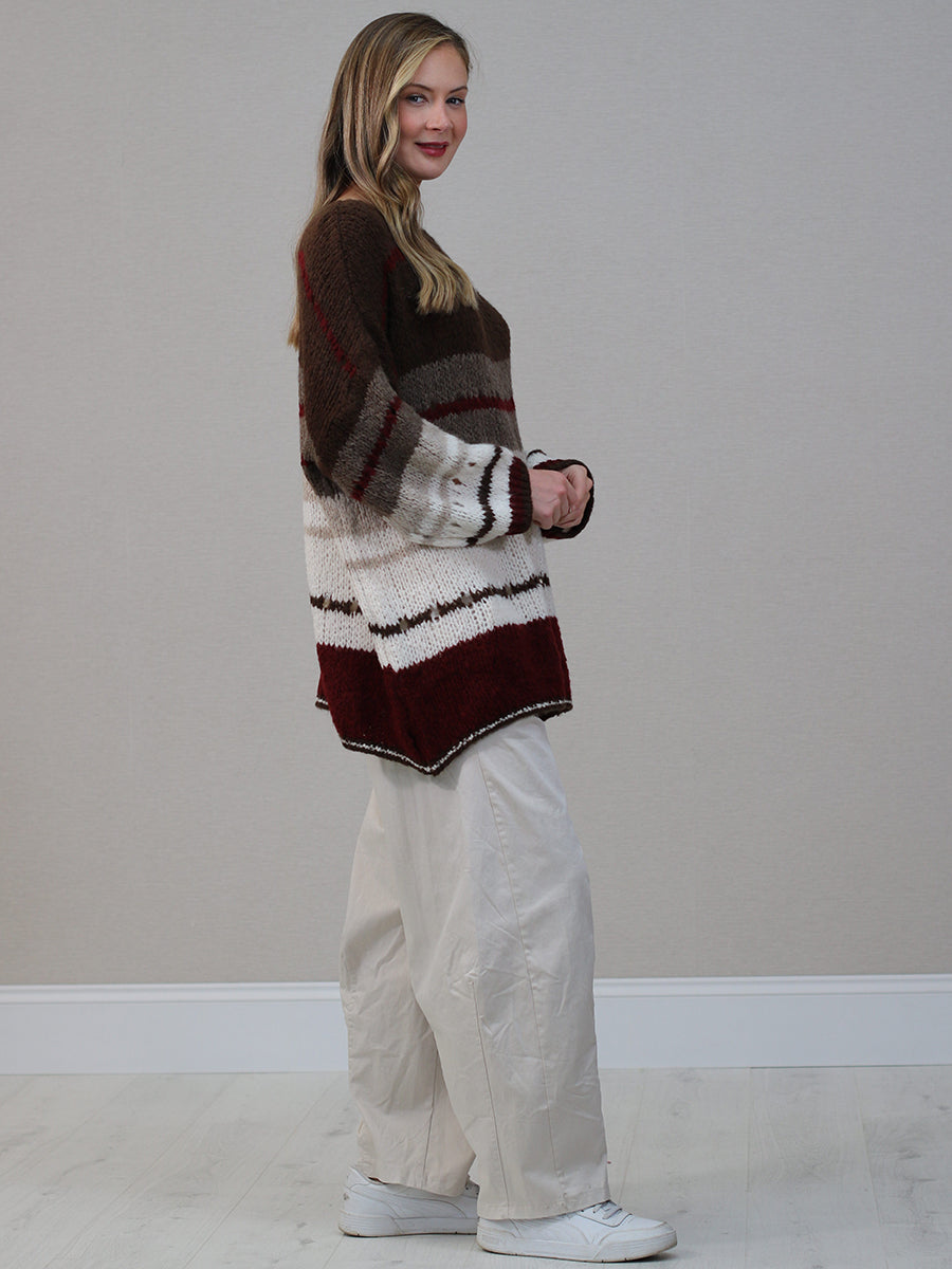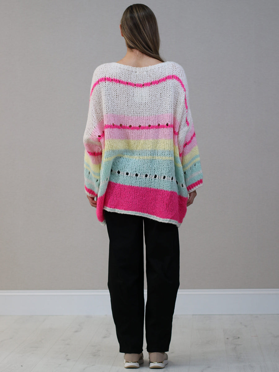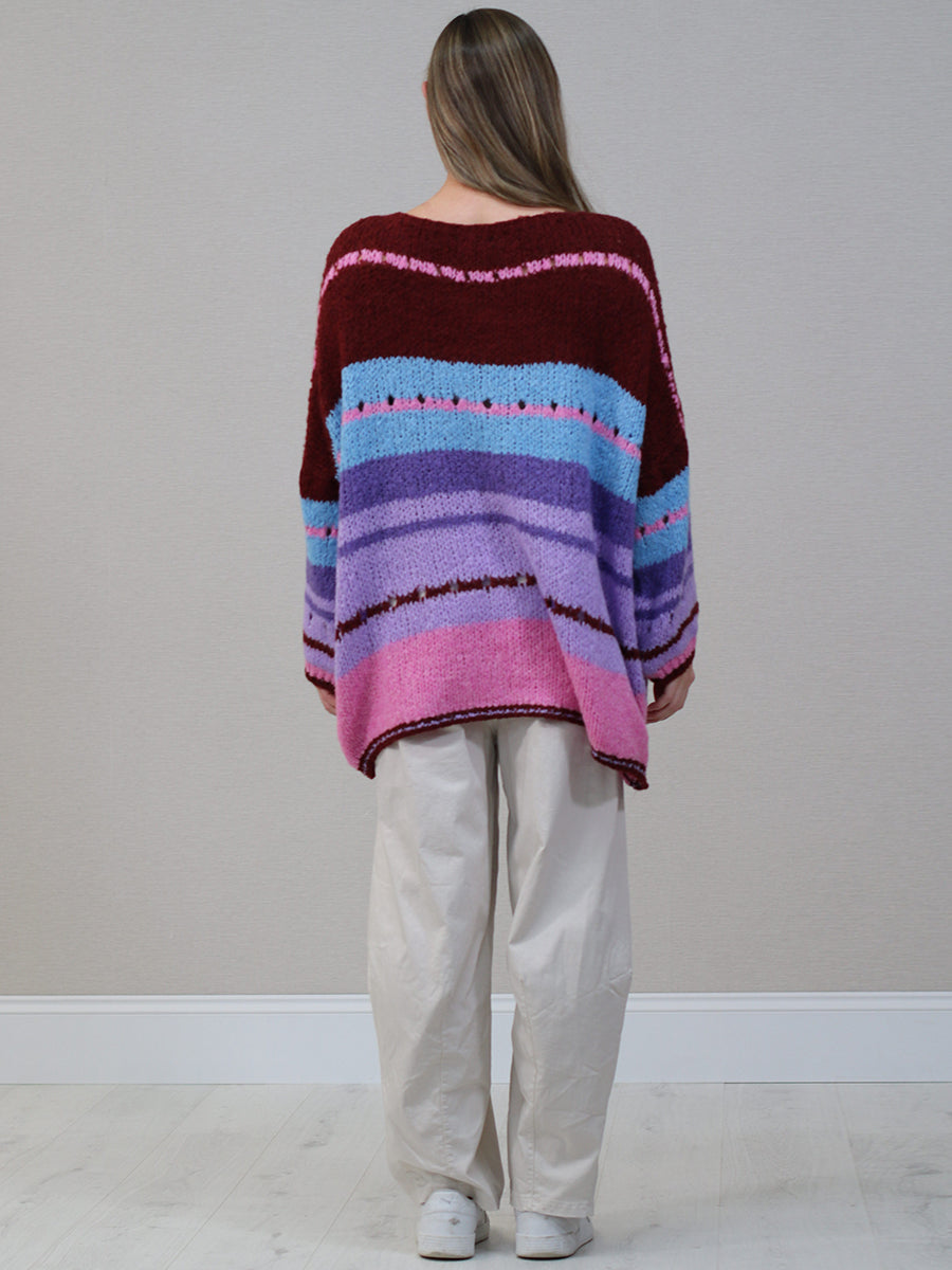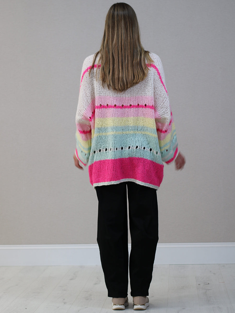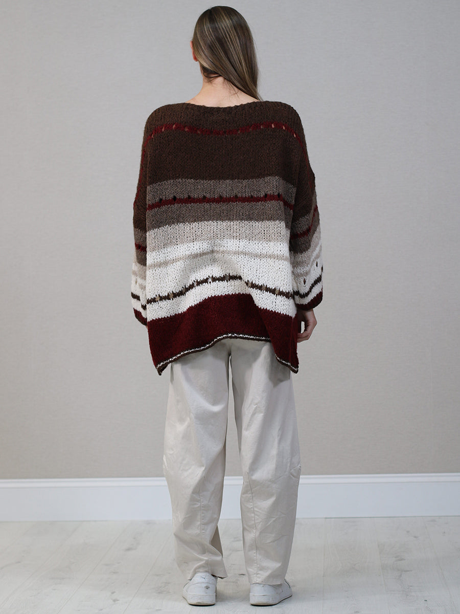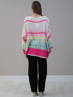 Add a playful edge to your cold-weather style with Fashion Boutique’s plus size woolen jumper. Designed with a lively multi-stripe pattern, a soft boat neckline, and dramatic batwing sleeves, it offers cozy warmth with a free-flowing silhouette. Made from premium fabric, this Italian knit makes layering easy, ensuring all-day comfort without compromising on chic appeal.
