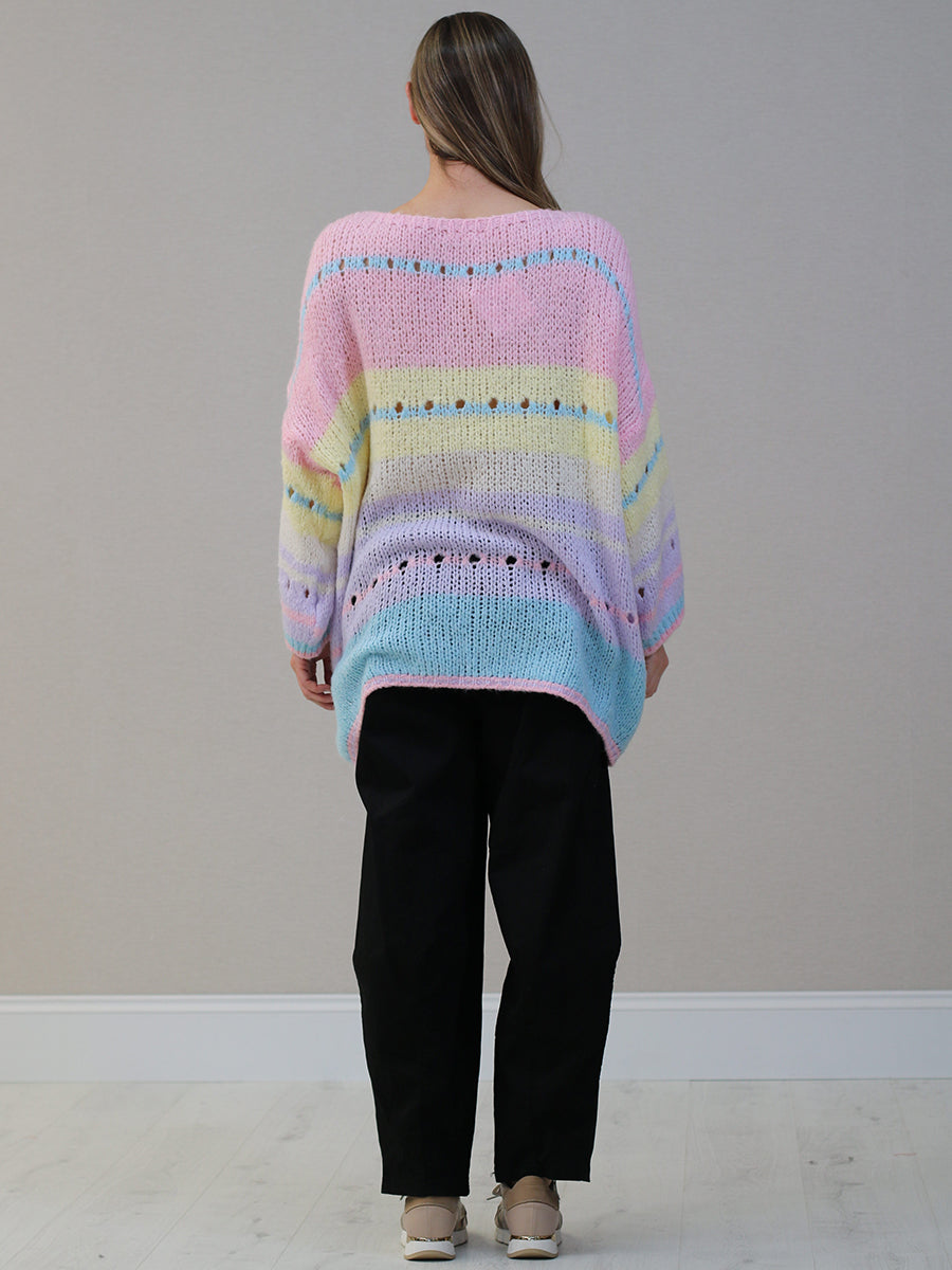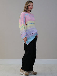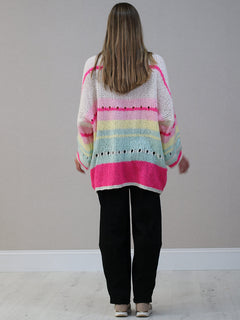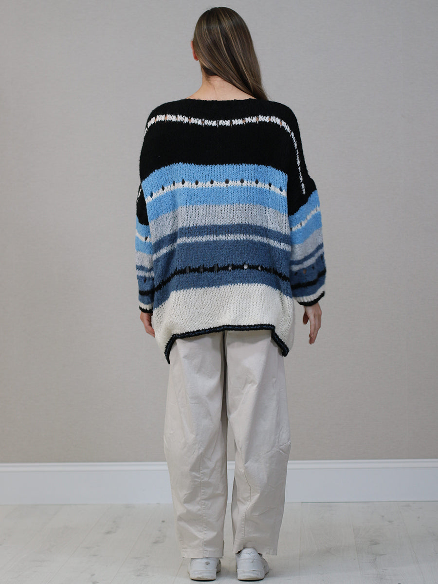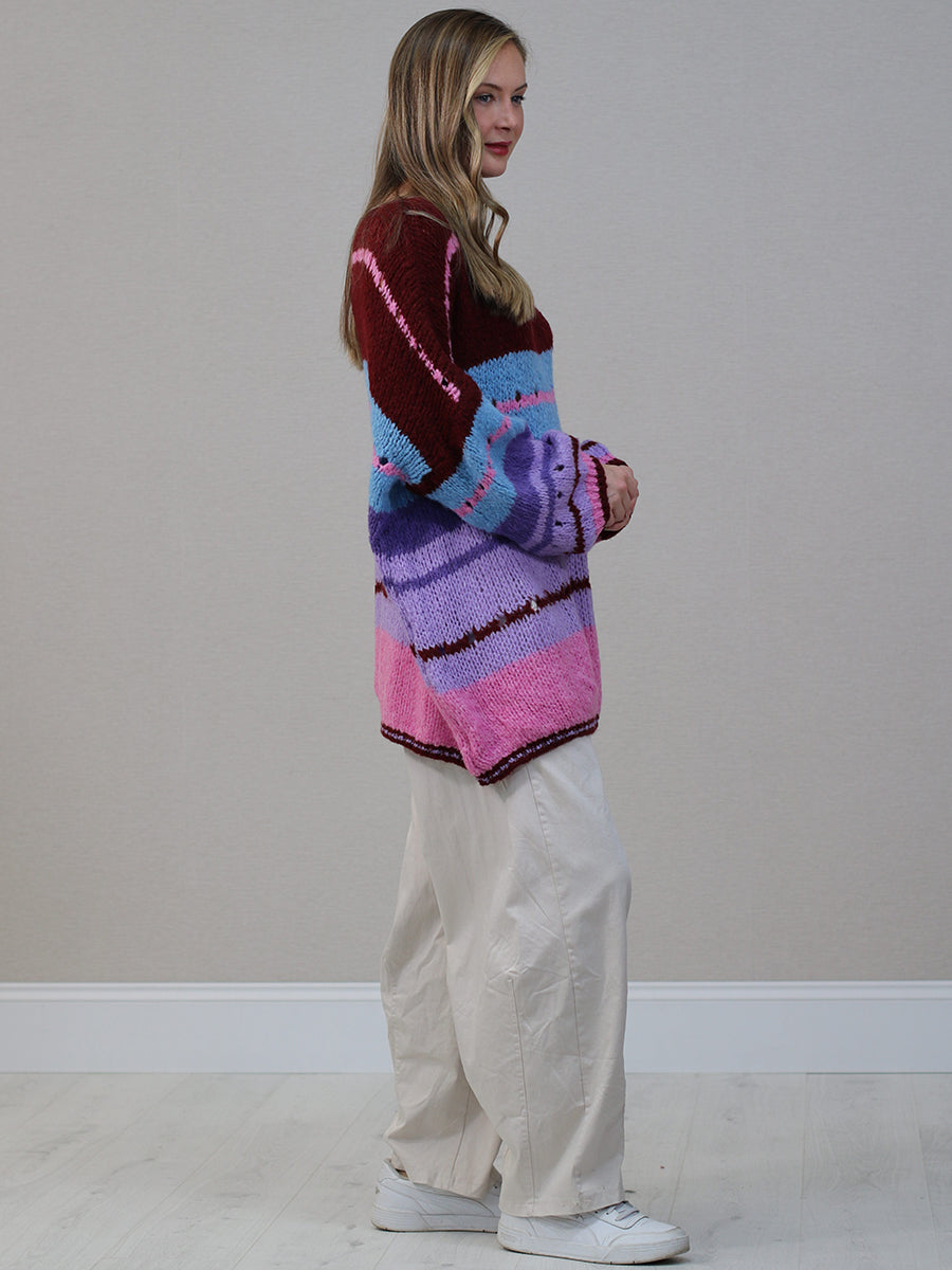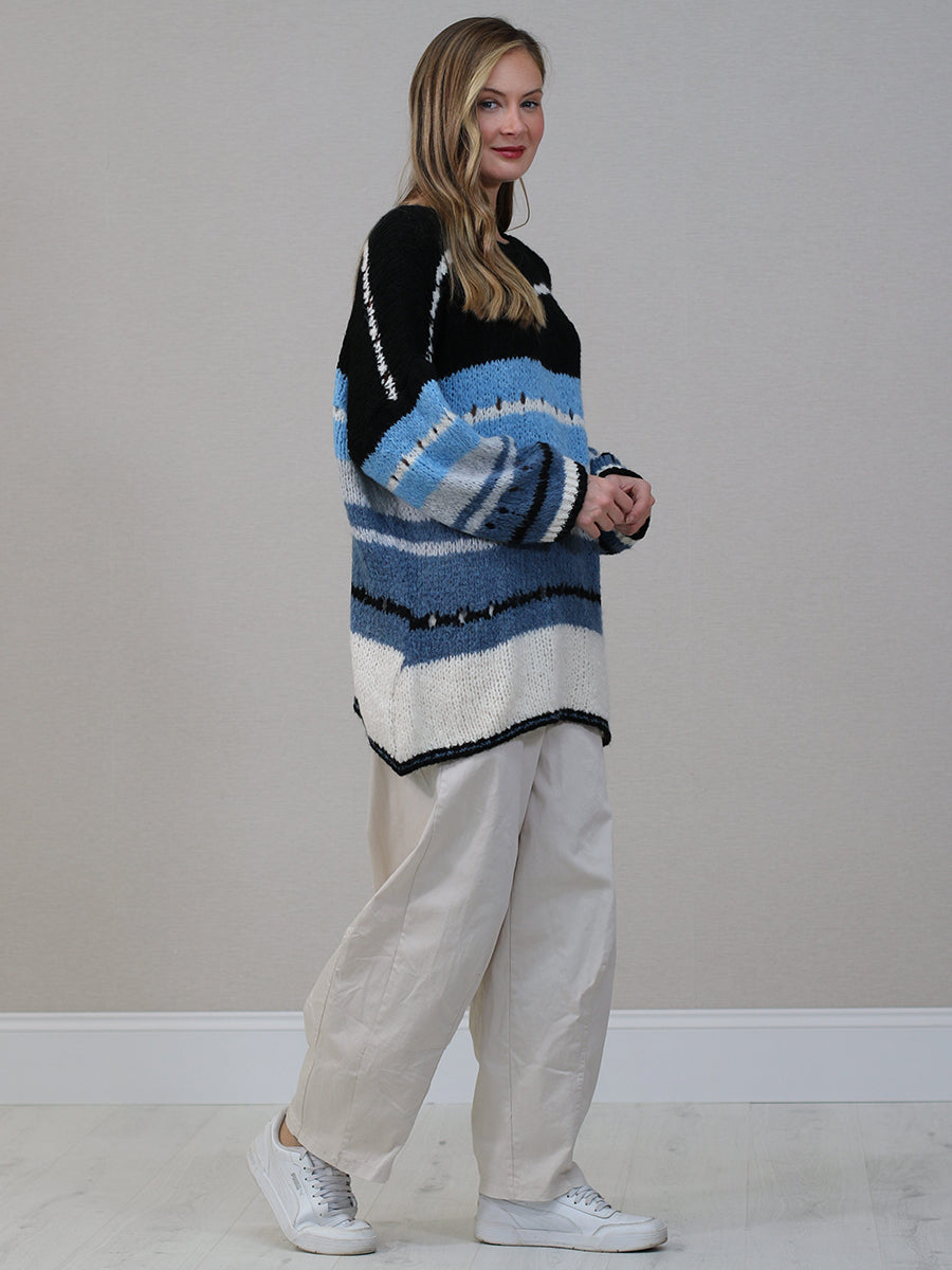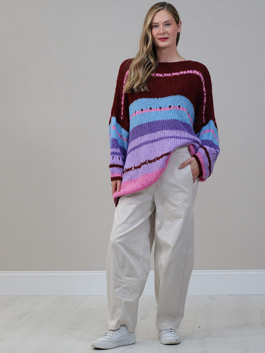 Add a playful edge to your cold-weather style with Fashion Boutique’s plus size woolen jumper. Designed with a lively multi-stripe pattern, a soft boat neckline, and dramatic batwing sleeves, it offers cozy warmth with a free-flowing silhouette. Made from premium fabric, this Italian knit makes layering easy, ensuring all-day comfort without compromising on chic appeal.