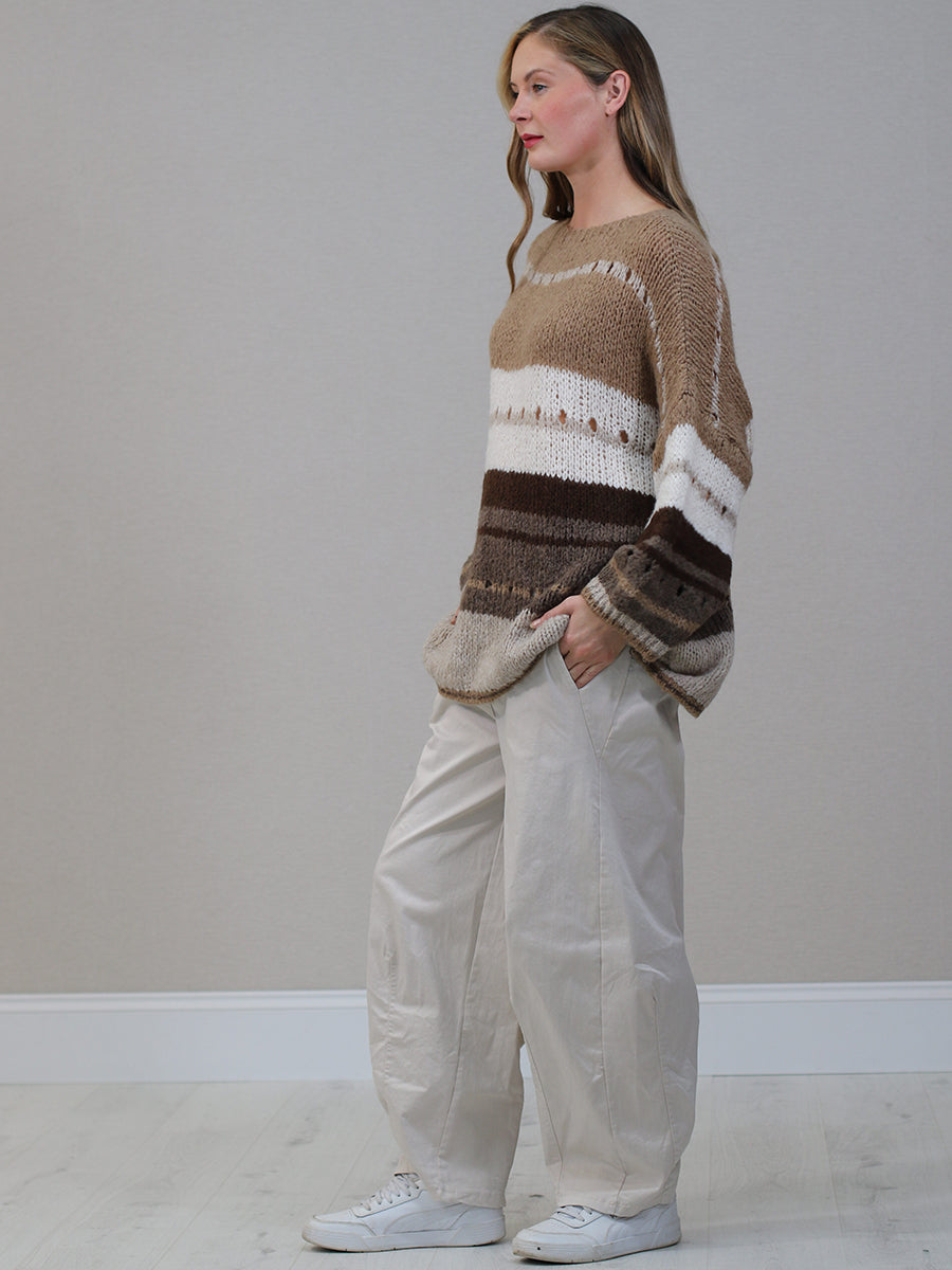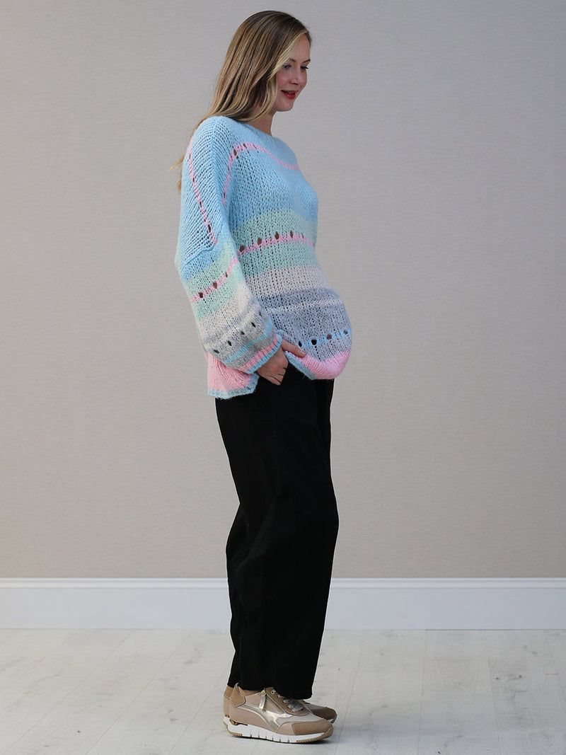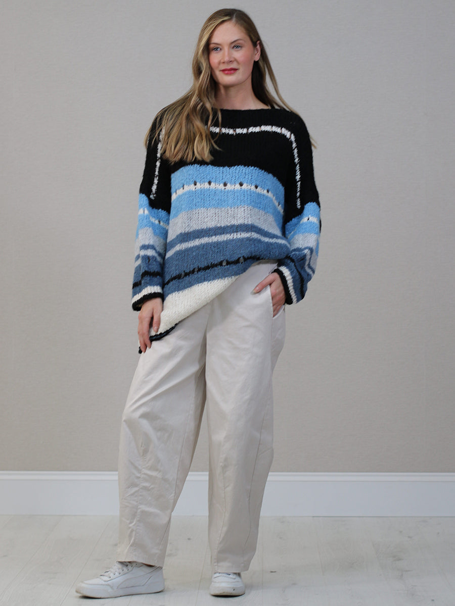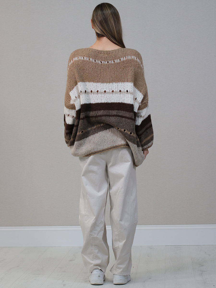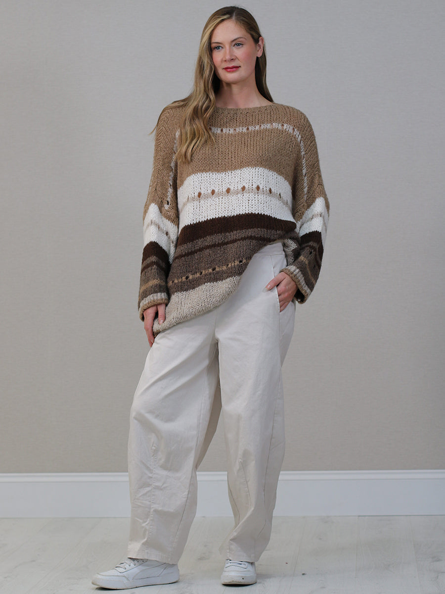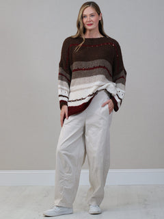 Add a playful edge to your cold-weather style with Fashion Boutique’s plus size woolen jumper. Designed with a lively multi-stripe pattern, a soft boat neckline, and dramatic batwing sleeves, it offers cozy warmth with a free-flowing silhouette. Made from premium fabric, this Italian knit makes layering easy, ensuring all-day comfort without compromising on chic appeal.