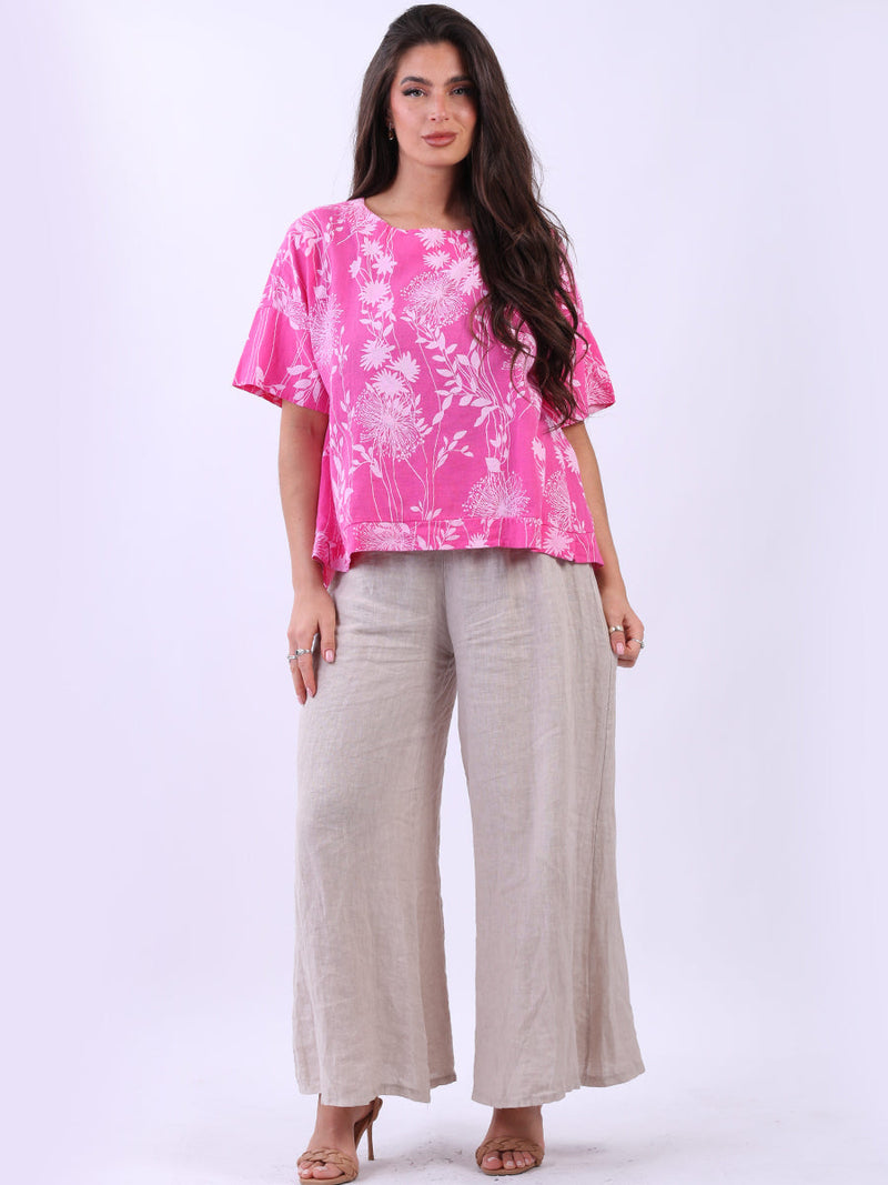 Sensational and vibrant made in Italy with high-quality linen it is the personal favorite of women wearers. The coziest and most comfortable fabric blends with features like a boat neckline, baggy short sleeves, a dipped hem, a botanical floral finish, and refreshing colors. Mix and match with wide-leg pants and a cotton jacket.