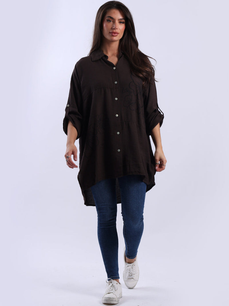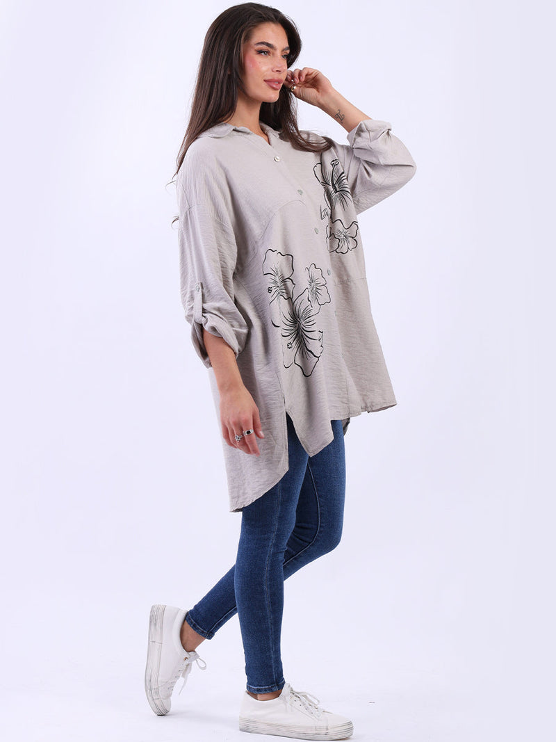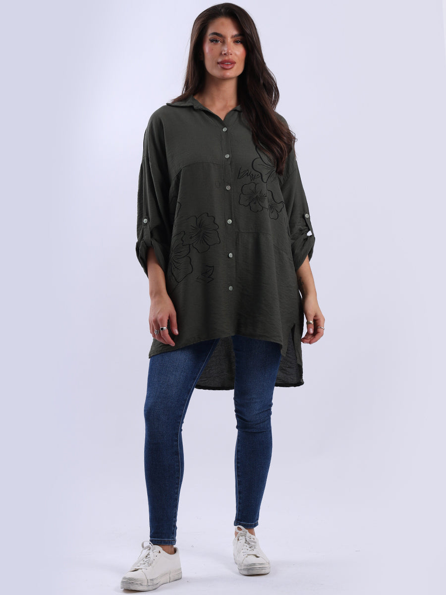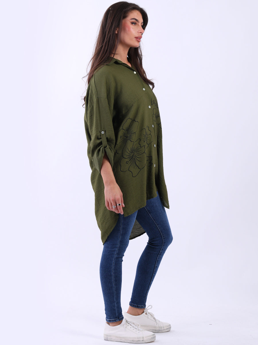 This Italian baggy shirt adorned with beautiful floral print. Featuring loose, relaxed fit with front buttons and dipped hem it adds a dramatic yet sleek touch to any outfit. Lovely ladies! Style it with wide-leg tailored trousers for a breathtaking look.
