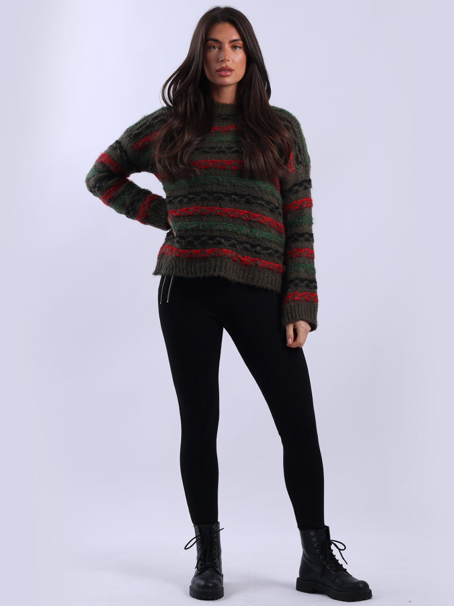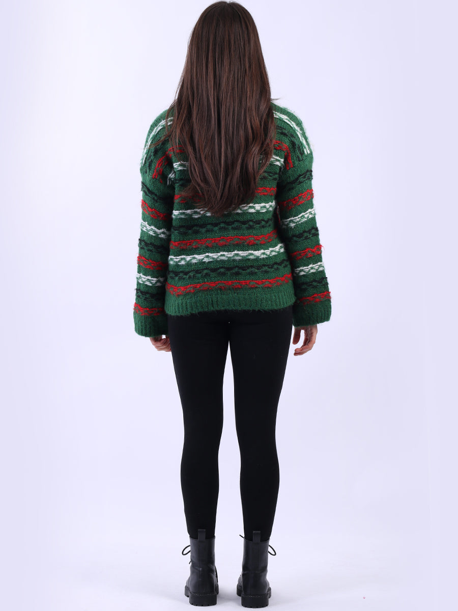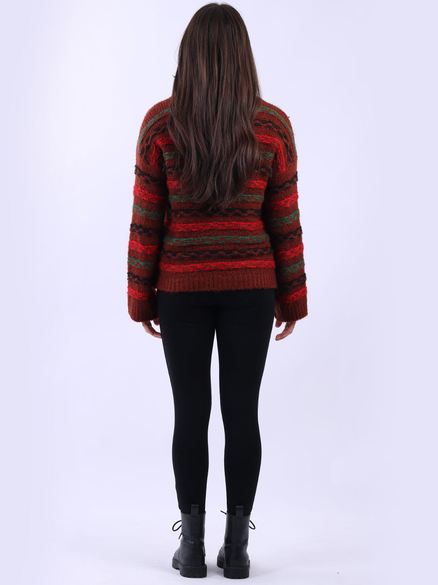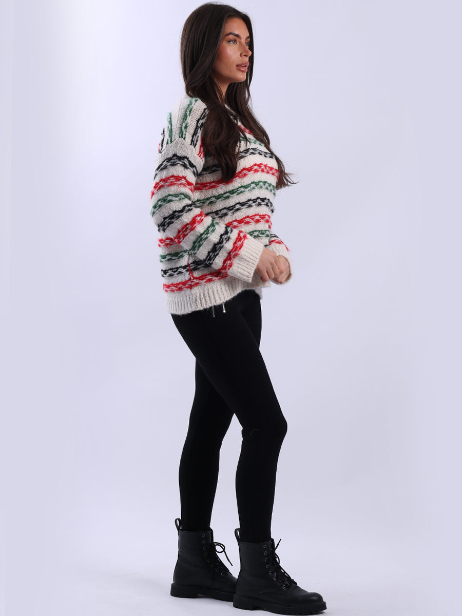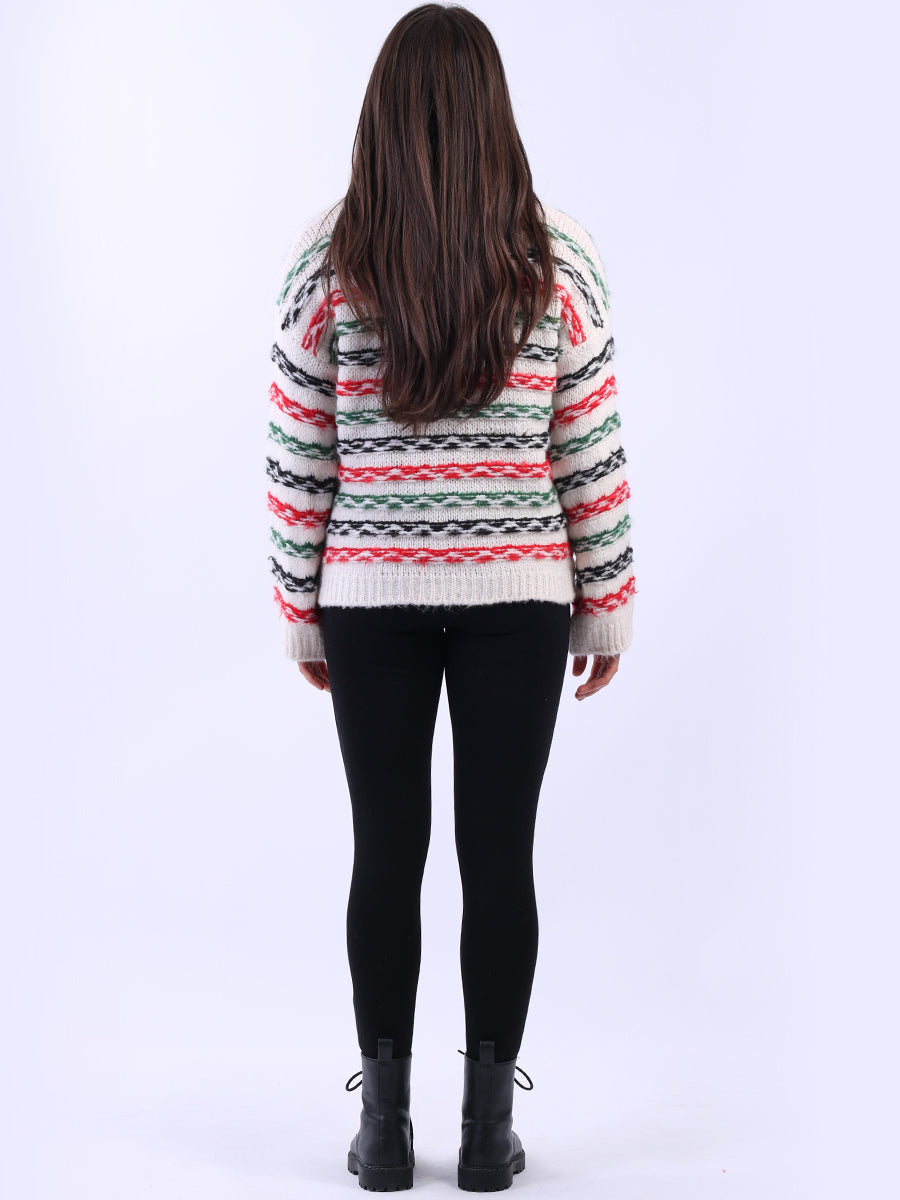 Inject a festive vibe to your winter wardrobe with this multi-colored striped jumper. All ready to wear on Christmas celebrations, this knitted jumper comes with a round neck and long sleeves, so you can have fun without compromising on comfort. A practical piece from our latest winter collection to style the way you want it.