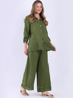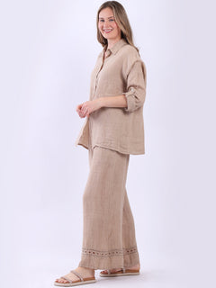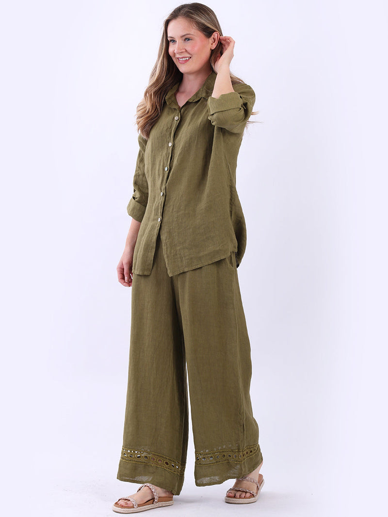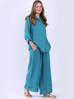This made-in-Italy plain button up linen shirt is a versatile addition to any women wearer's classy wardrobe. The crochet net panel on the back elevate its aesthetics making it a timeless piece of refinement, while tabbed sleeves, collared neck keep the vibe sophisticated. Its soft breathable fabric and loose fit makes it ideal for both casual outings and office wear.