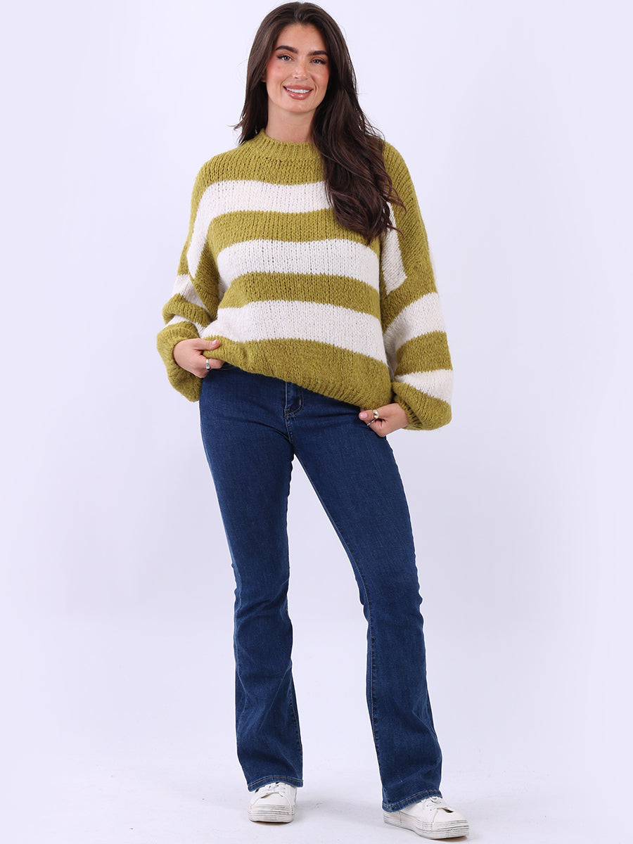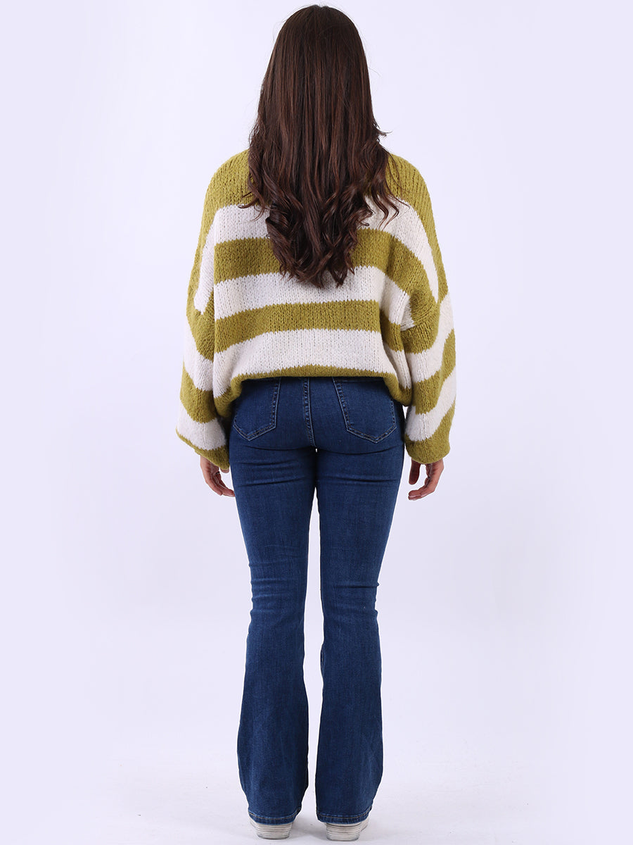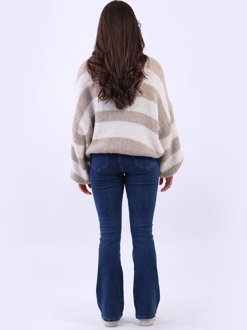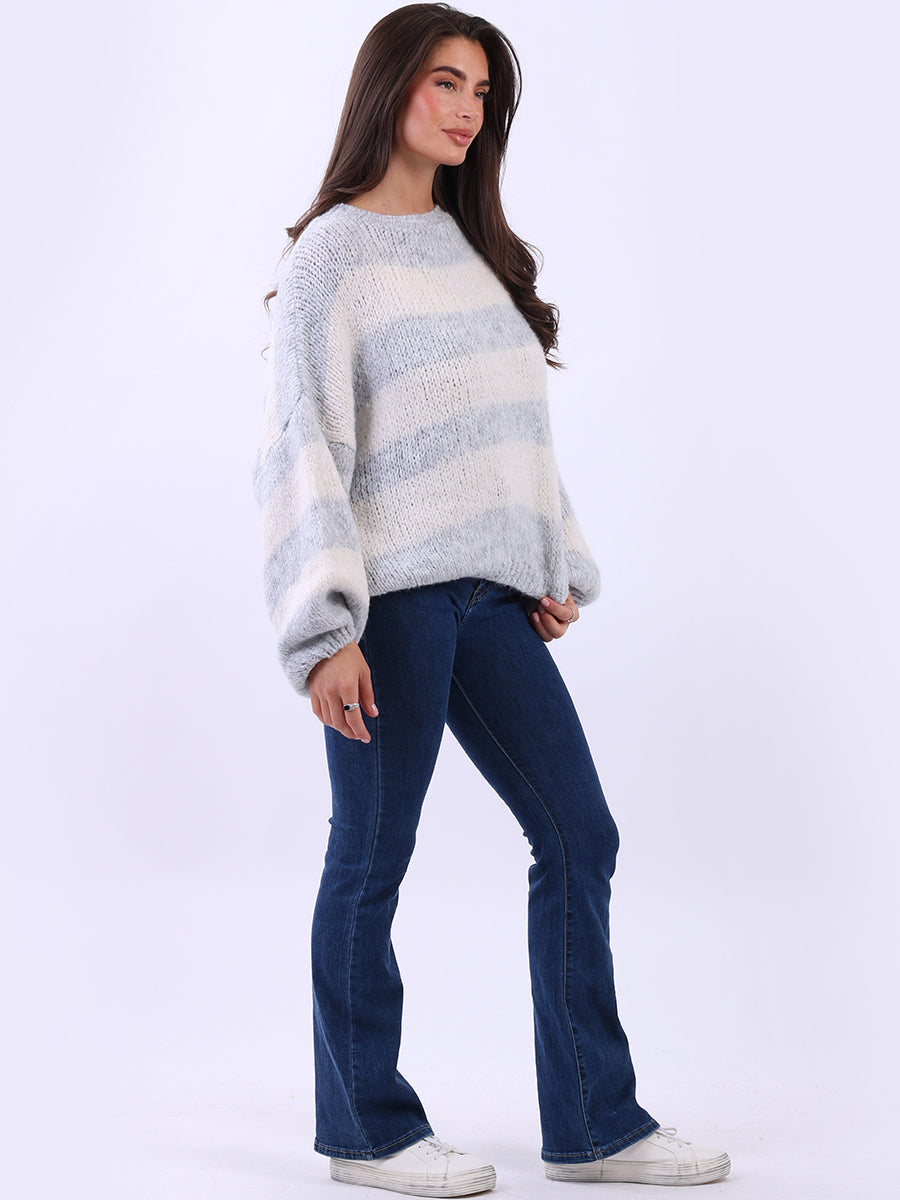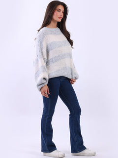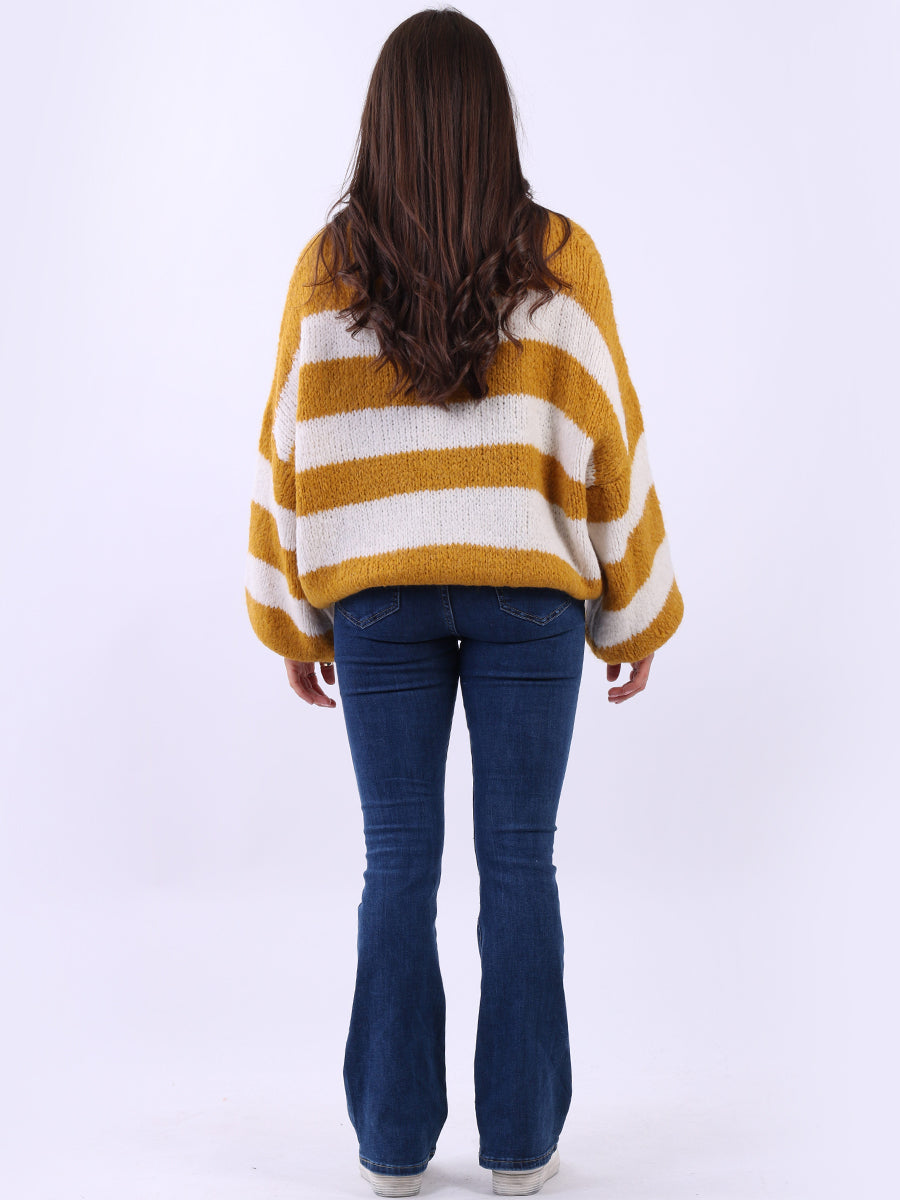 Designed for plus-size women wearers, this knitted wool jumper in a batwing design is sure to give a soft and warm feel. The stitch details in a stripy pattern exude a stylish look, completing the piece. The loose baggy fit provides a sense of room and ease, perfect for layering over a top as ladies desire.