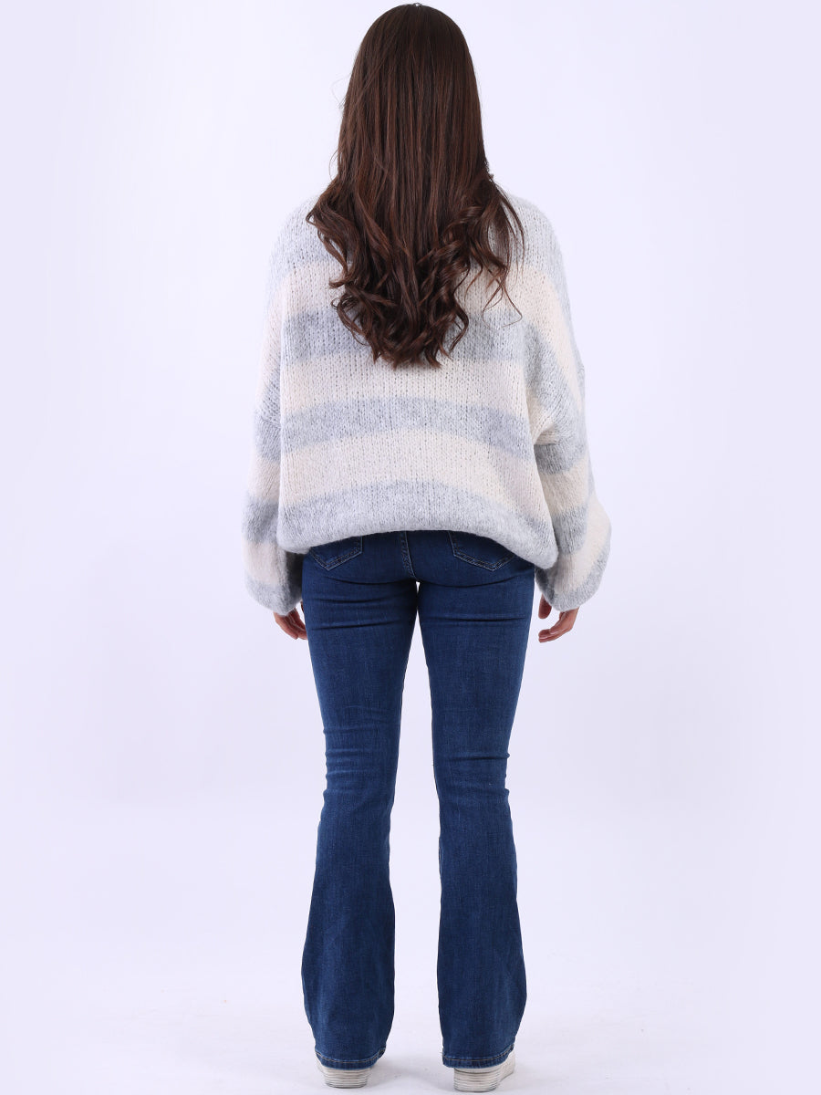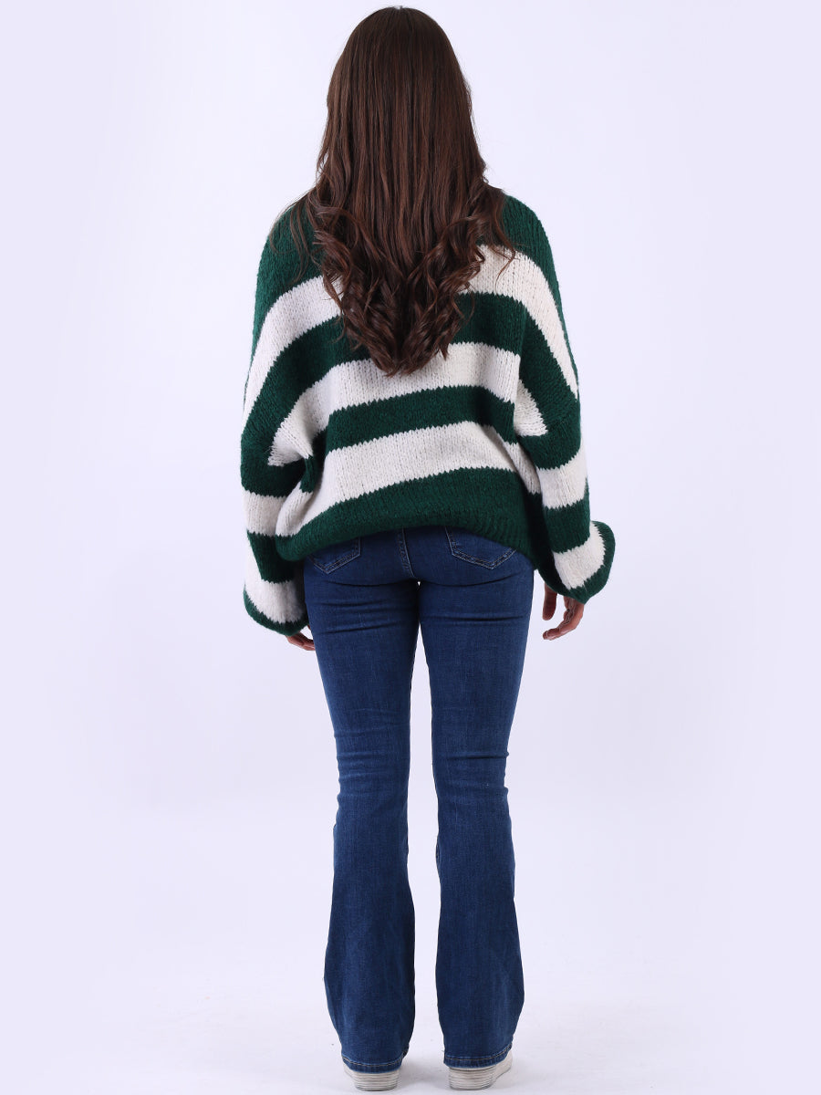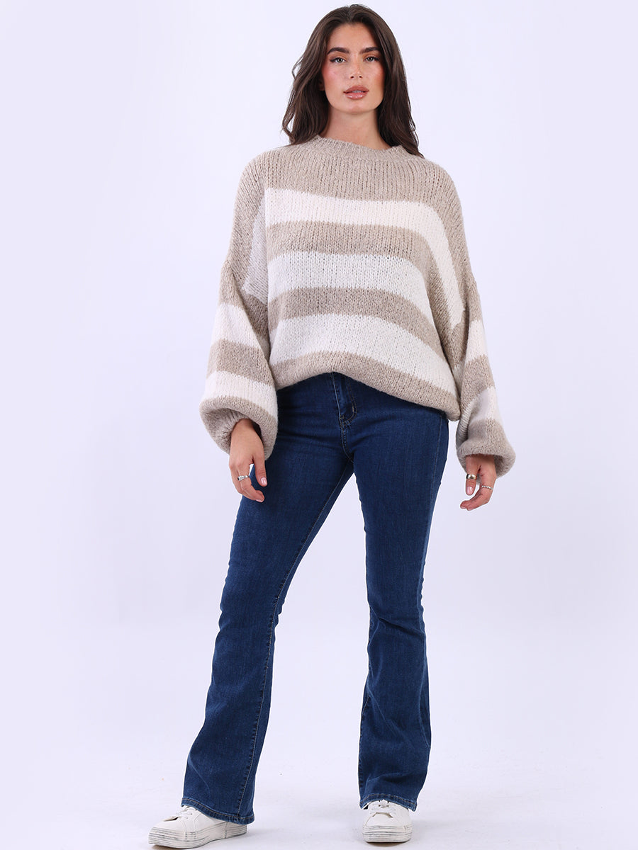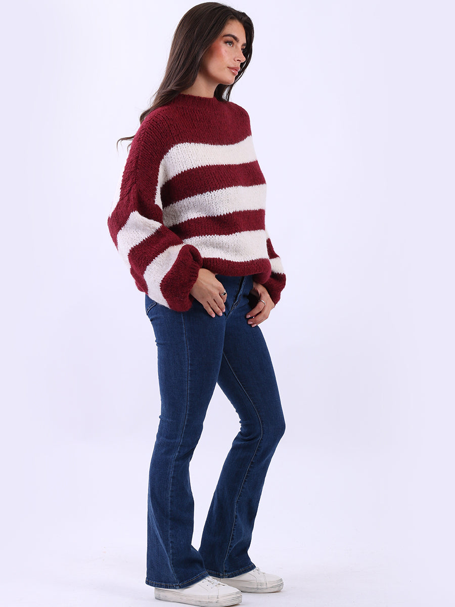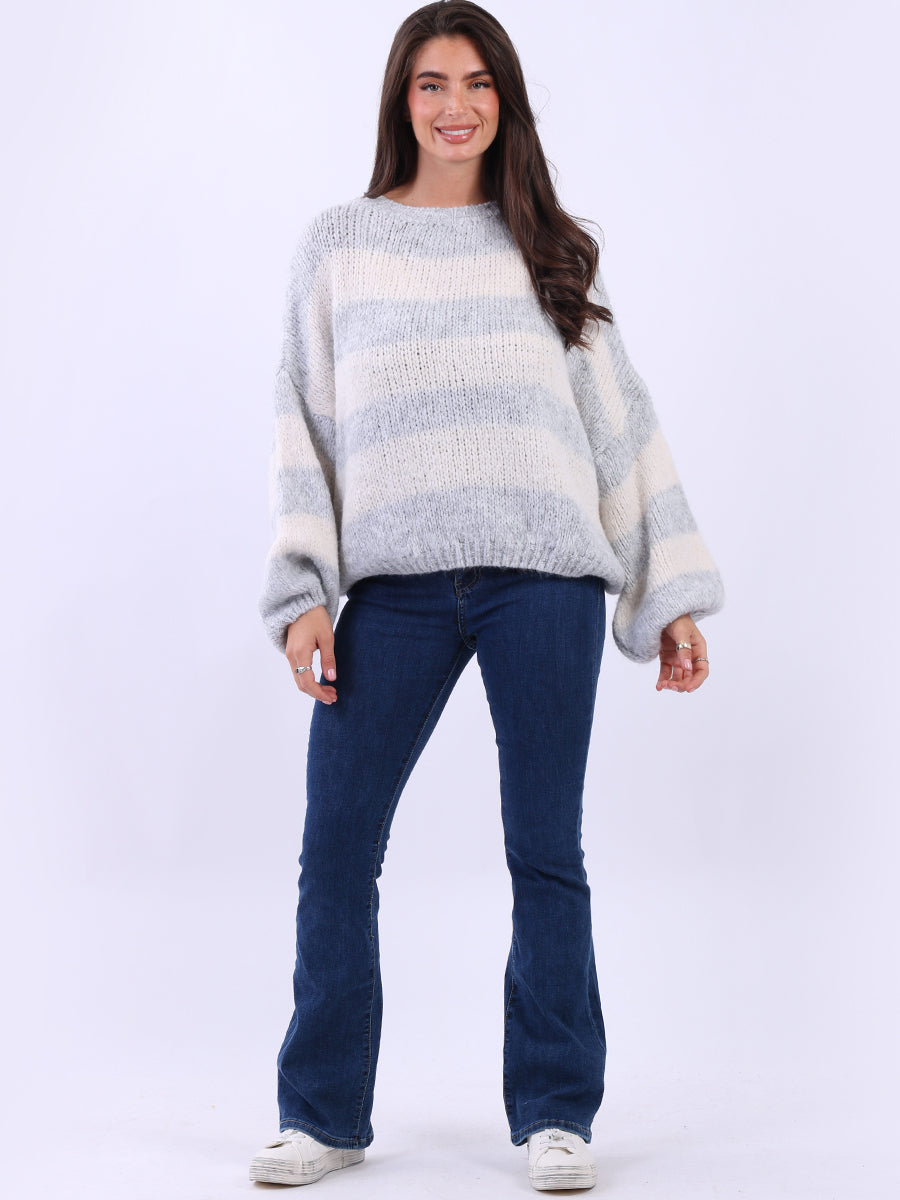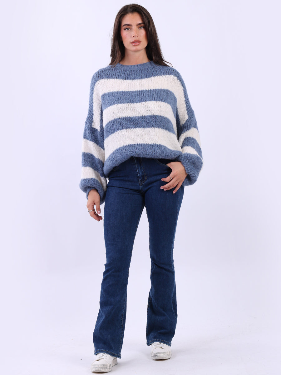 Designed for plus-size women wearers, this knitted wool jumper in a batwing design is sure to give a soft and warm feel. The stitch details in a stripy pattern exude a stylish look, completing the piece. The loose baggy fit provides a sense of room and ease, perfect for layering over a top as ladies desire.