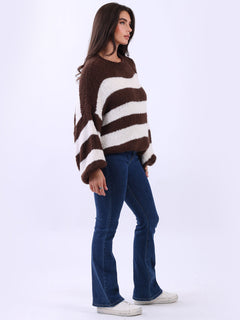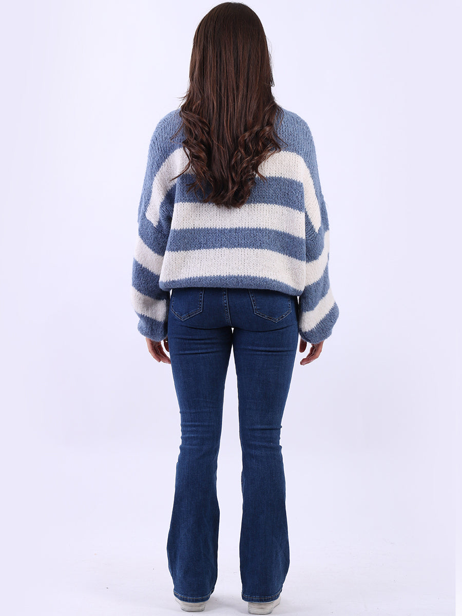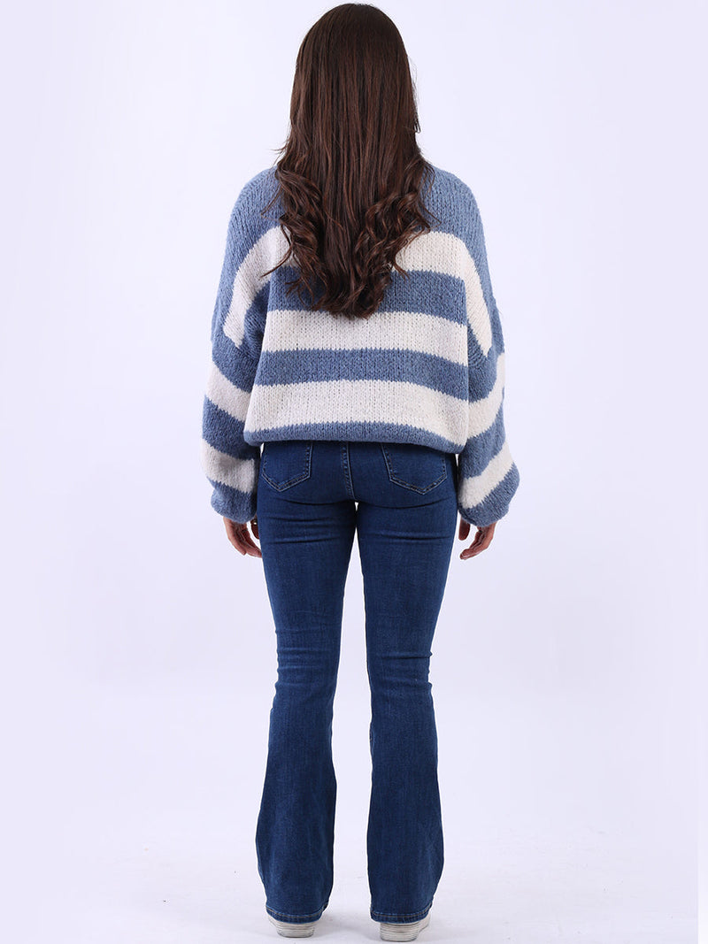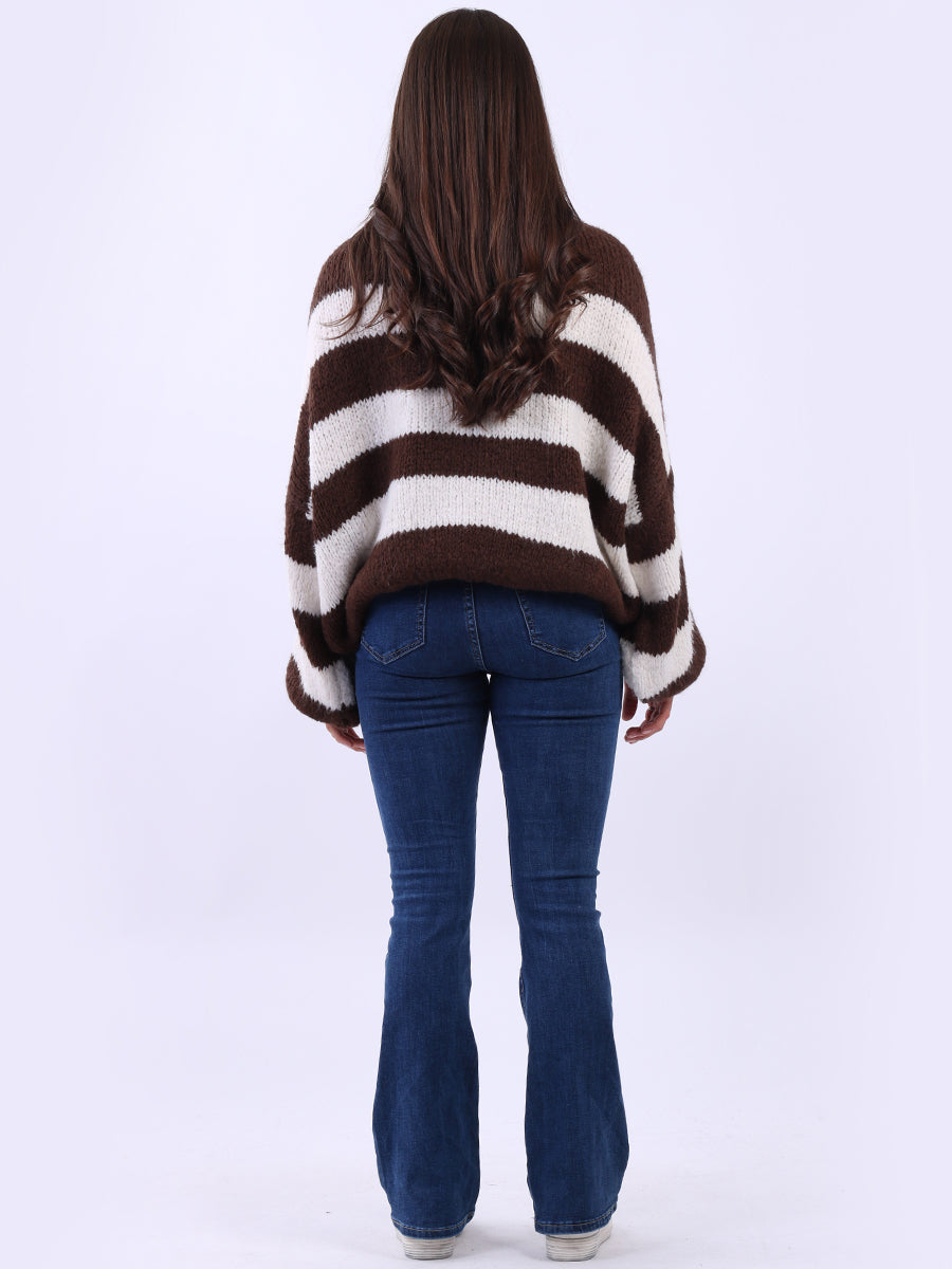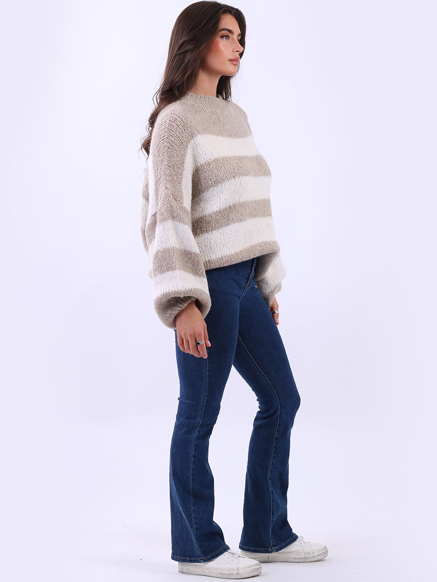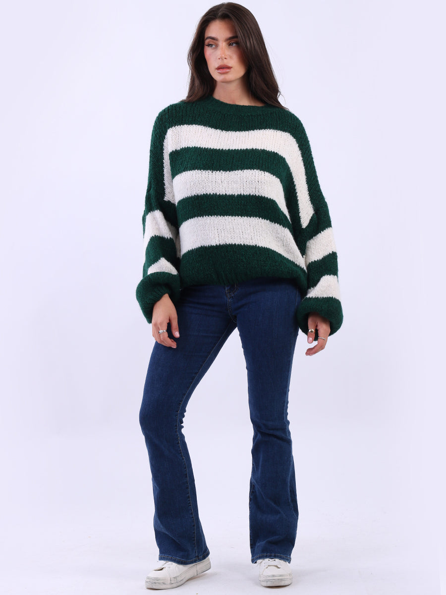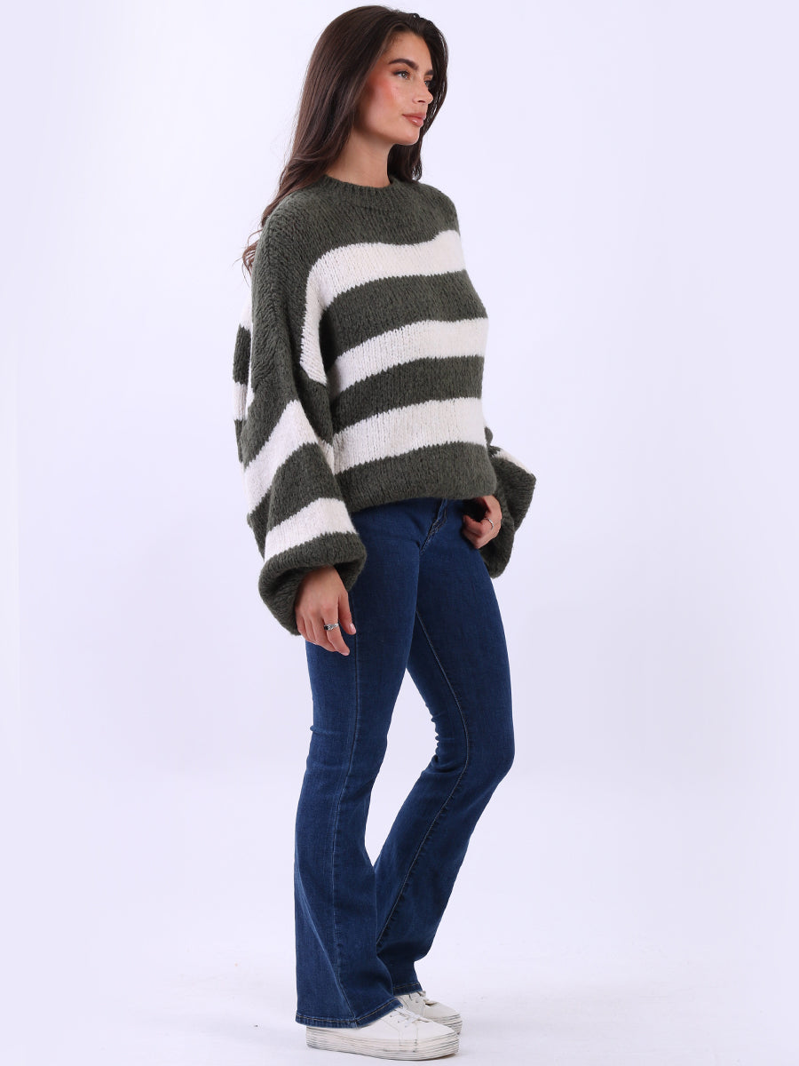Designed for plus-size women wearers, this knitted wool jumper in a batwing design is sure to give a soft and warm feel. The stitch details in a stripy pattern exude a stylish look, completing the piece. The loose baggy fit provides a sense of room and ease, perfect for layering over a top as ladies desire.