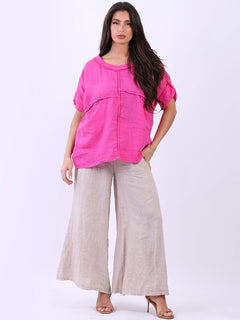 Earthy tones that are seasonal, comfortable, and full of character and form. Made in Italy with high-quality linen that makes the women wearers set stunning vibes with its wide round neckline, tabbed sleeves, and front pockets. This top has a pleated detailing frontside finish which makes it just fabulous. Team it up with denims and sneakers.