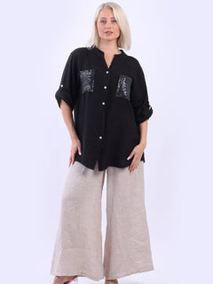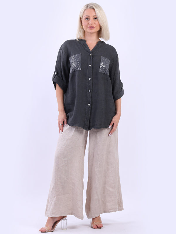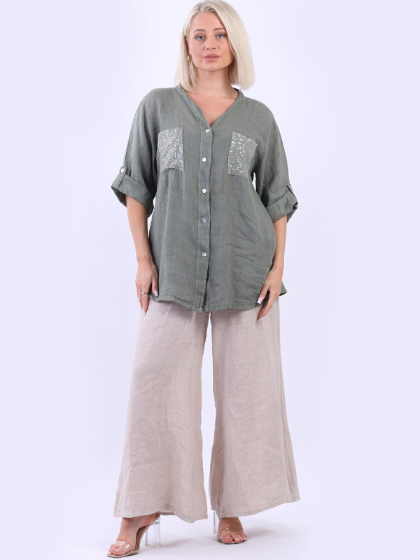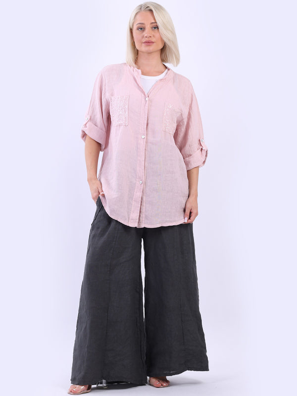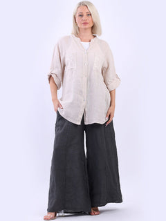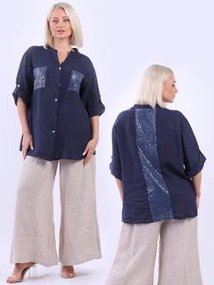 Elegant and effortless the baggy plus size blouse is made in Italy for promising quality, ban collar neckline, bold colors and front sequin pockets. The soft breathable lino is just all hype for all the right reasons as it is light weight and breezy. Front pockets and long button up buckle sleeves make it practical and work ready versatile. Dress it with wide leg pants and wedges for crisp finish.