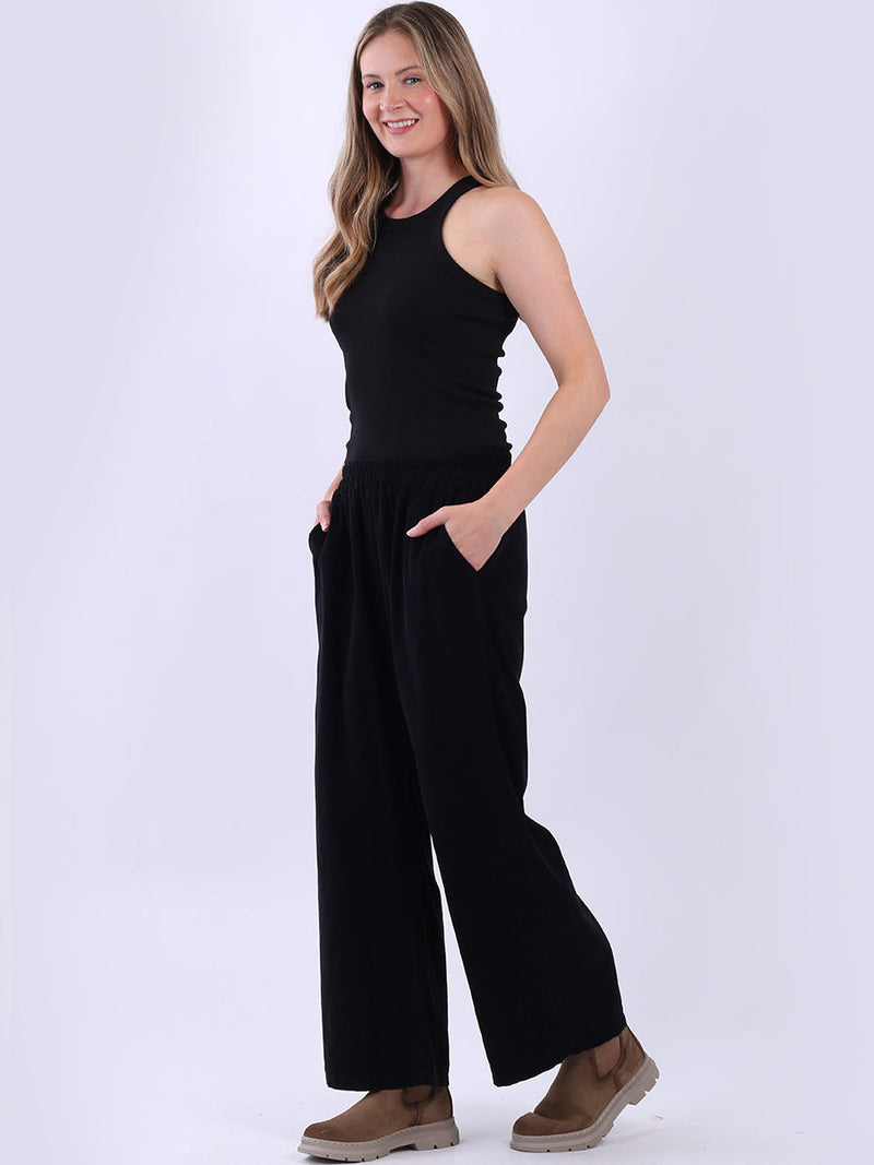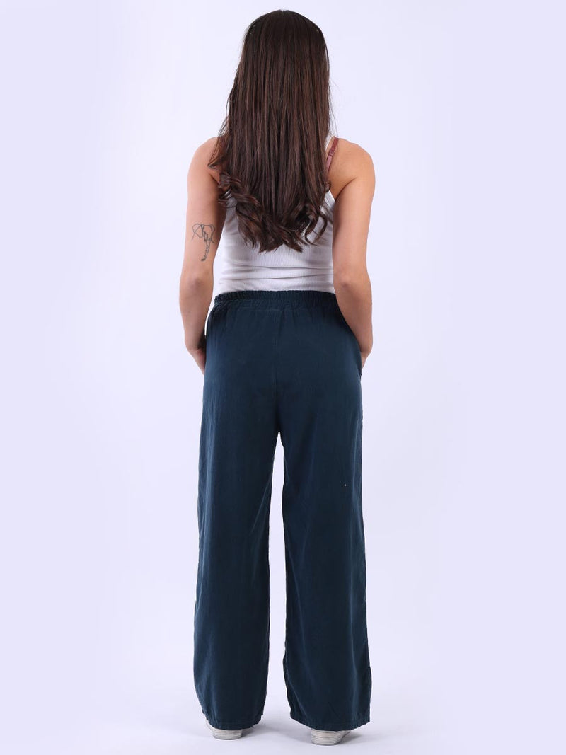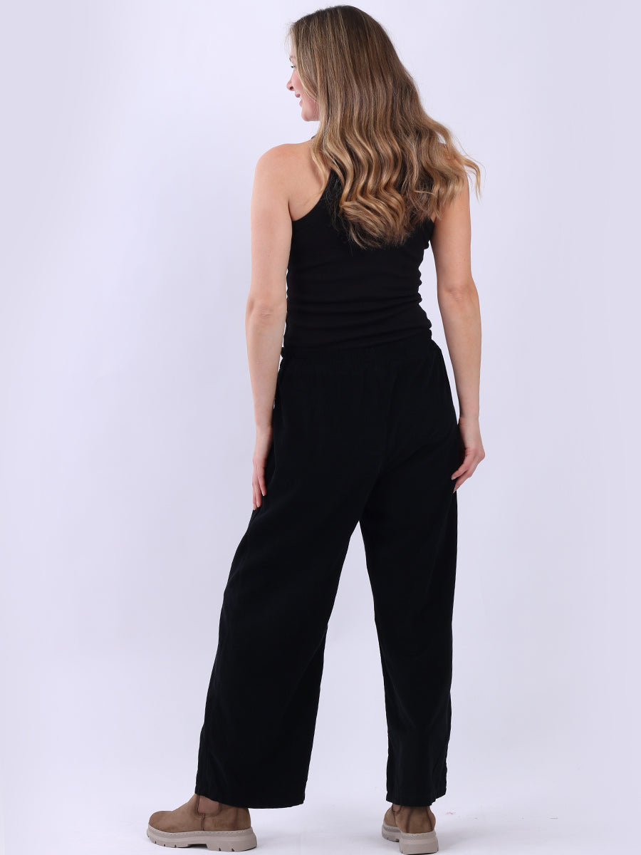 Imagine slipping into these plain cotton corduroy trousers on a misty morning. They are not just trousers, but a cocoon of comfort with a blend of style. Featuring an elastic waist, side pockets, and a wide-leg design, they are modern and trendy. Women wearers would love to pair them with a knitted jumper for an evening walk on fallen leaves.