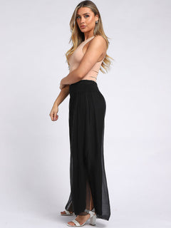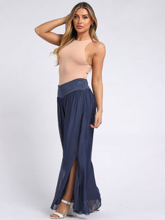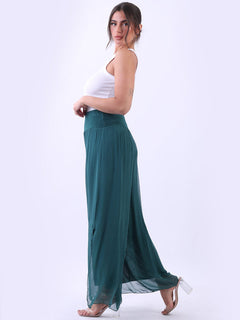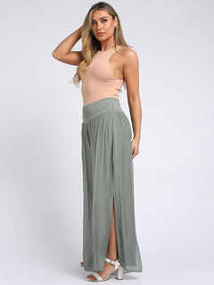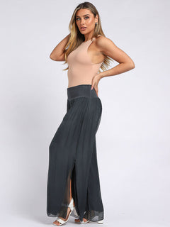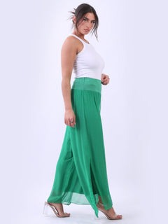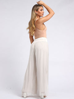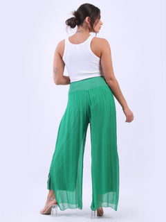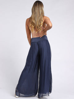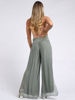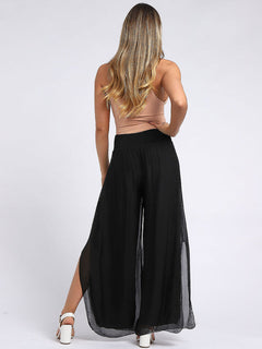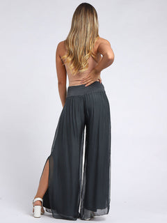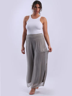 Perfect for formal occasions and crafted from luxurious silk fabric, these made in Italy trousers from RWS Market offer a soft touch against the skin. The wide-leg design ensures freedom of movement, while the side slit and wide elastic band add a touch of sophistication to the silhouette. With their relaxed fit, these trousers blend modern trends and versatility, making them a must have for women wearers.
