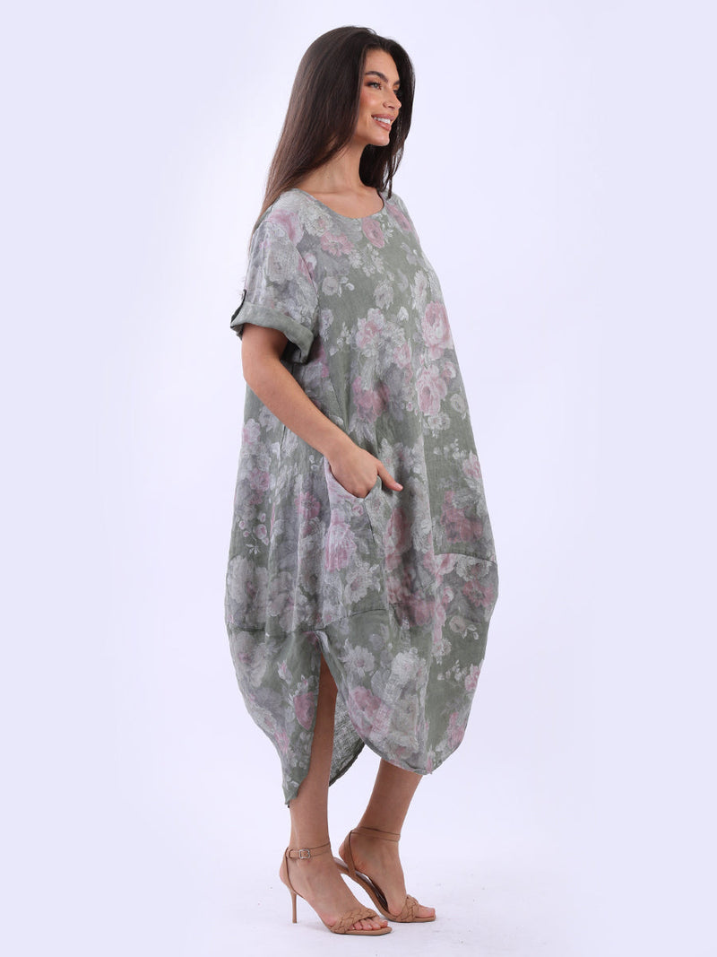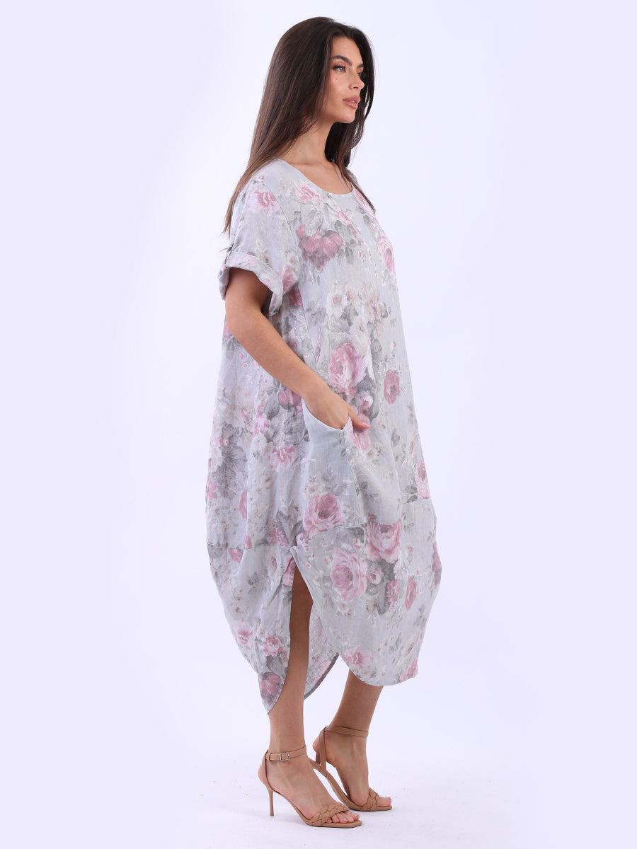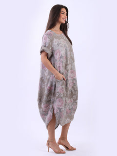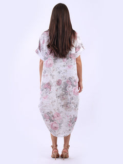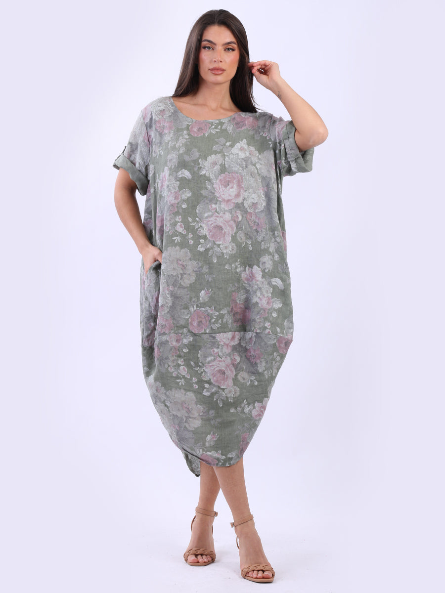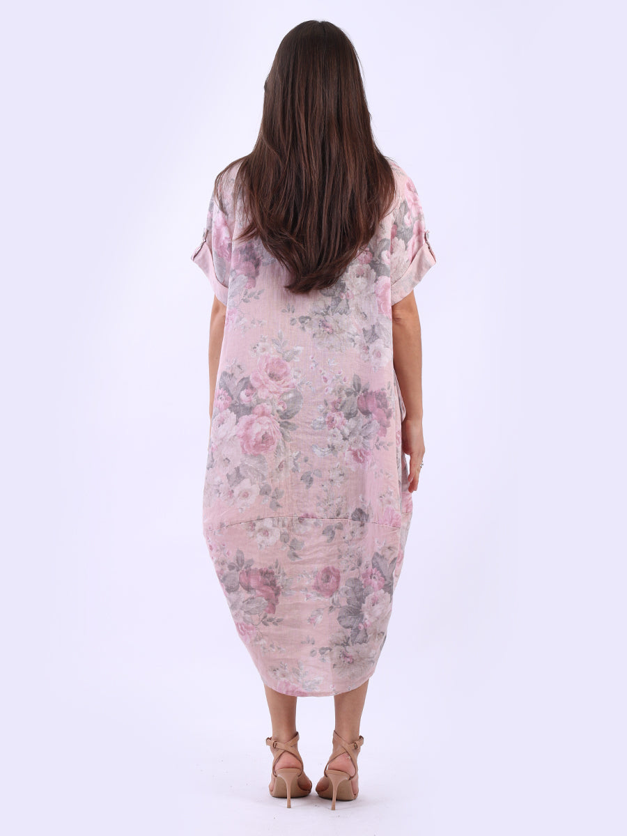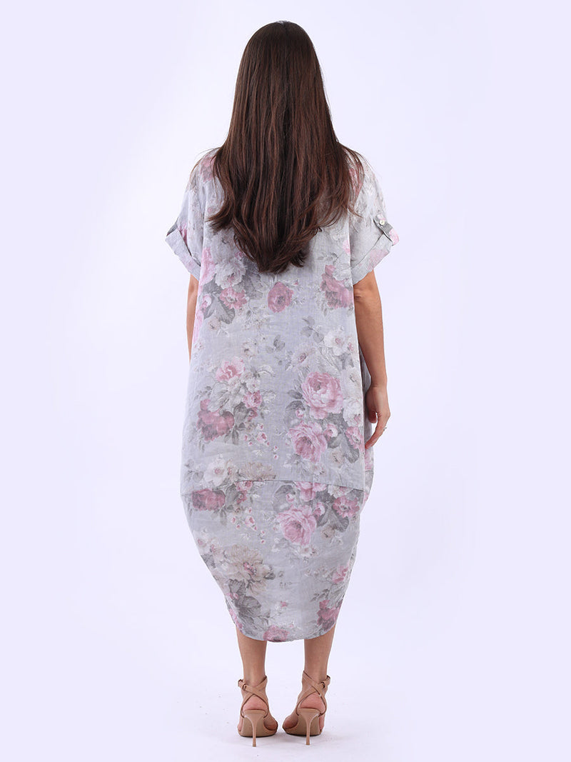Oversized Linen Floral Print Midi Dress