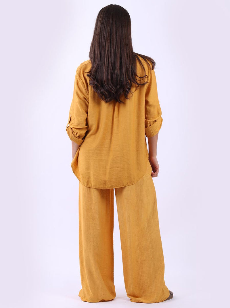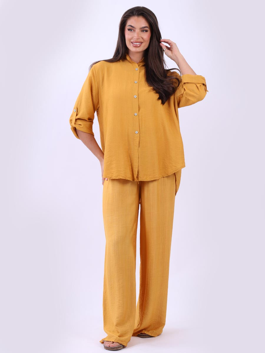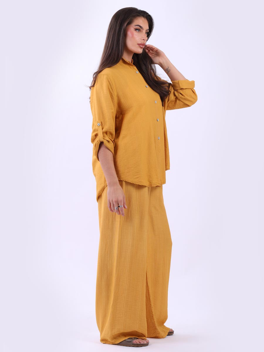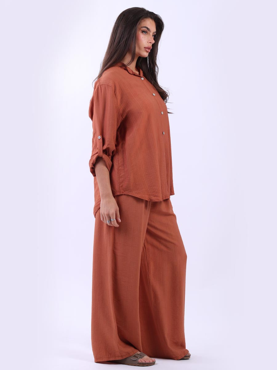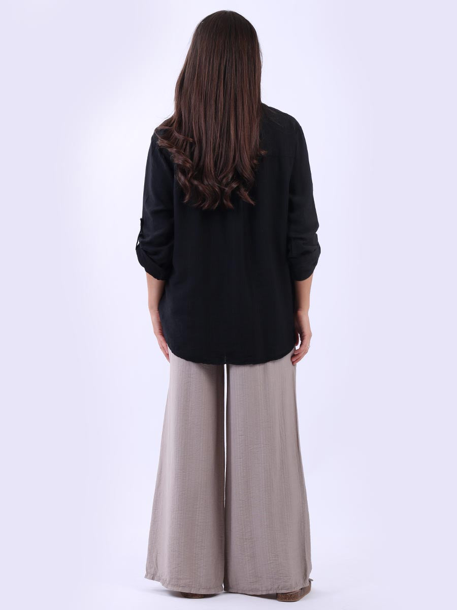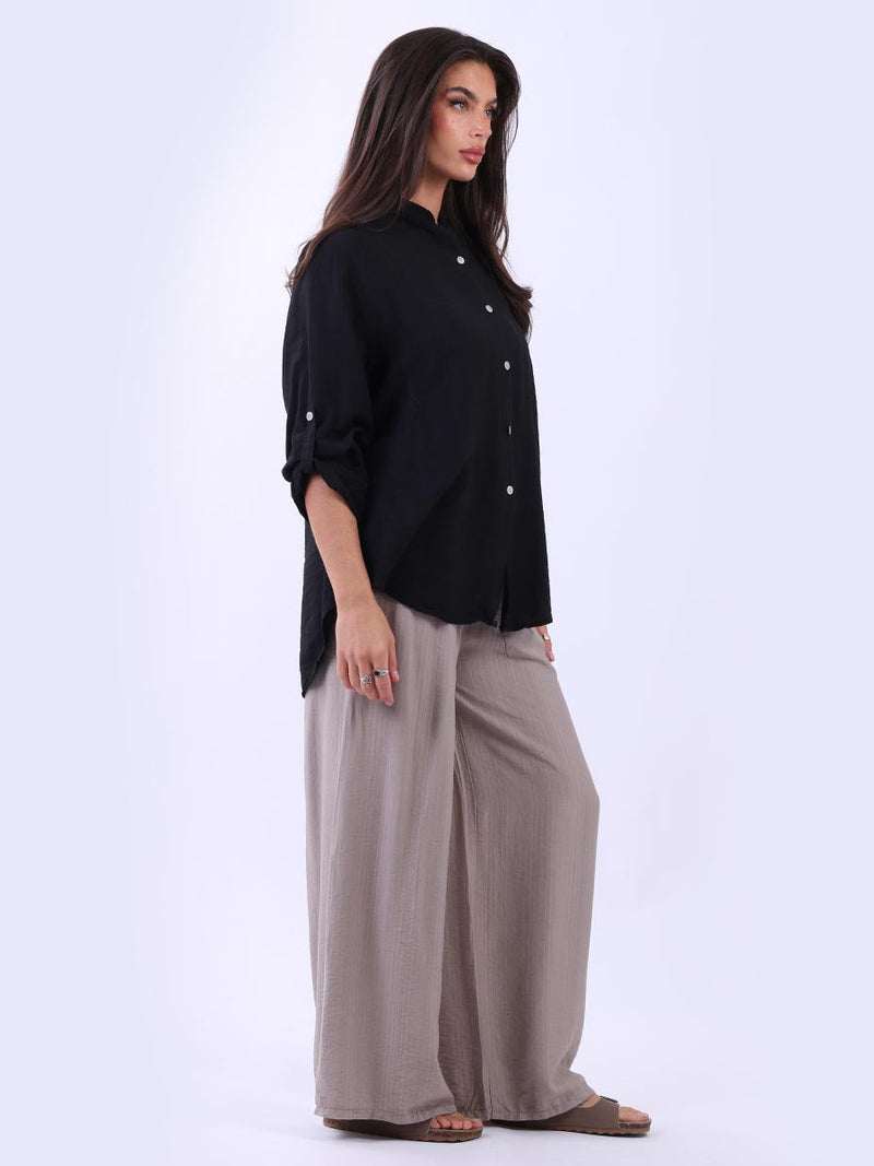 This plain front knotted button down shirt in various colors is a vibrant choice for any wardrobe. Made in Italy, it features a sleek band collar, long tabbed sleeves and a stylish hi-lo hem. Designed in a casual loose fit, this top is perfect for those plus size ladies who don't wish to compromise on style and comfort.