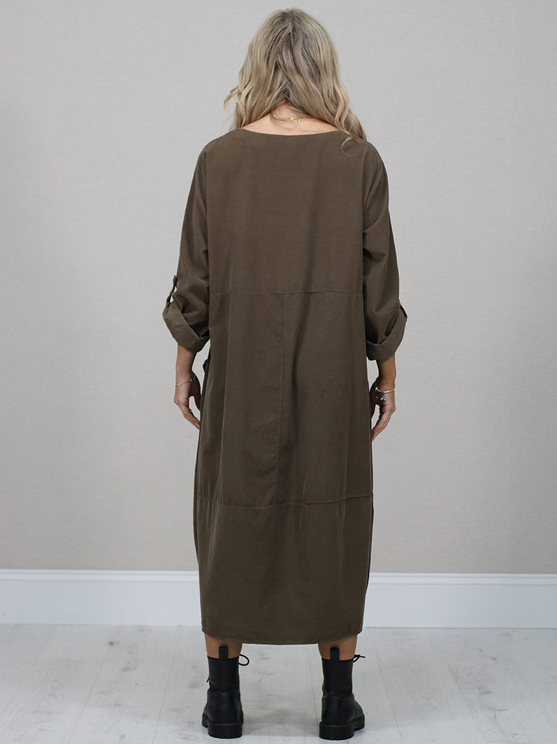 Simple, comfy, and effortlessly cool, that’s what this oversized solid corduroy dress is all about. With its slouchy, laid-back fit, it’s just right for plus-size ladies who love a casual, stylish look. The soft cotton fabric feels great, and it’s easy to throw on whether you’re lounging or running around during fall and winter.