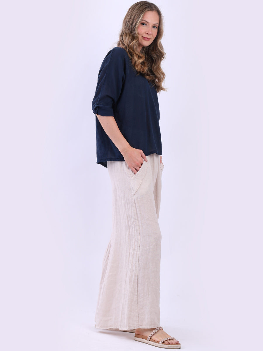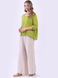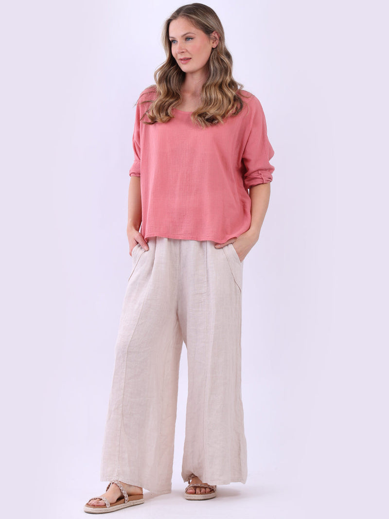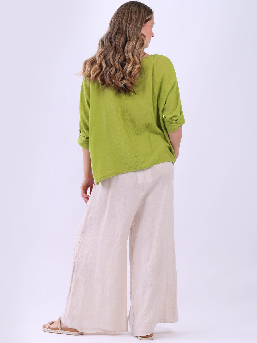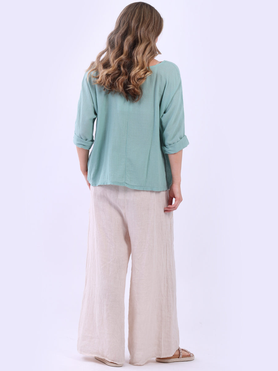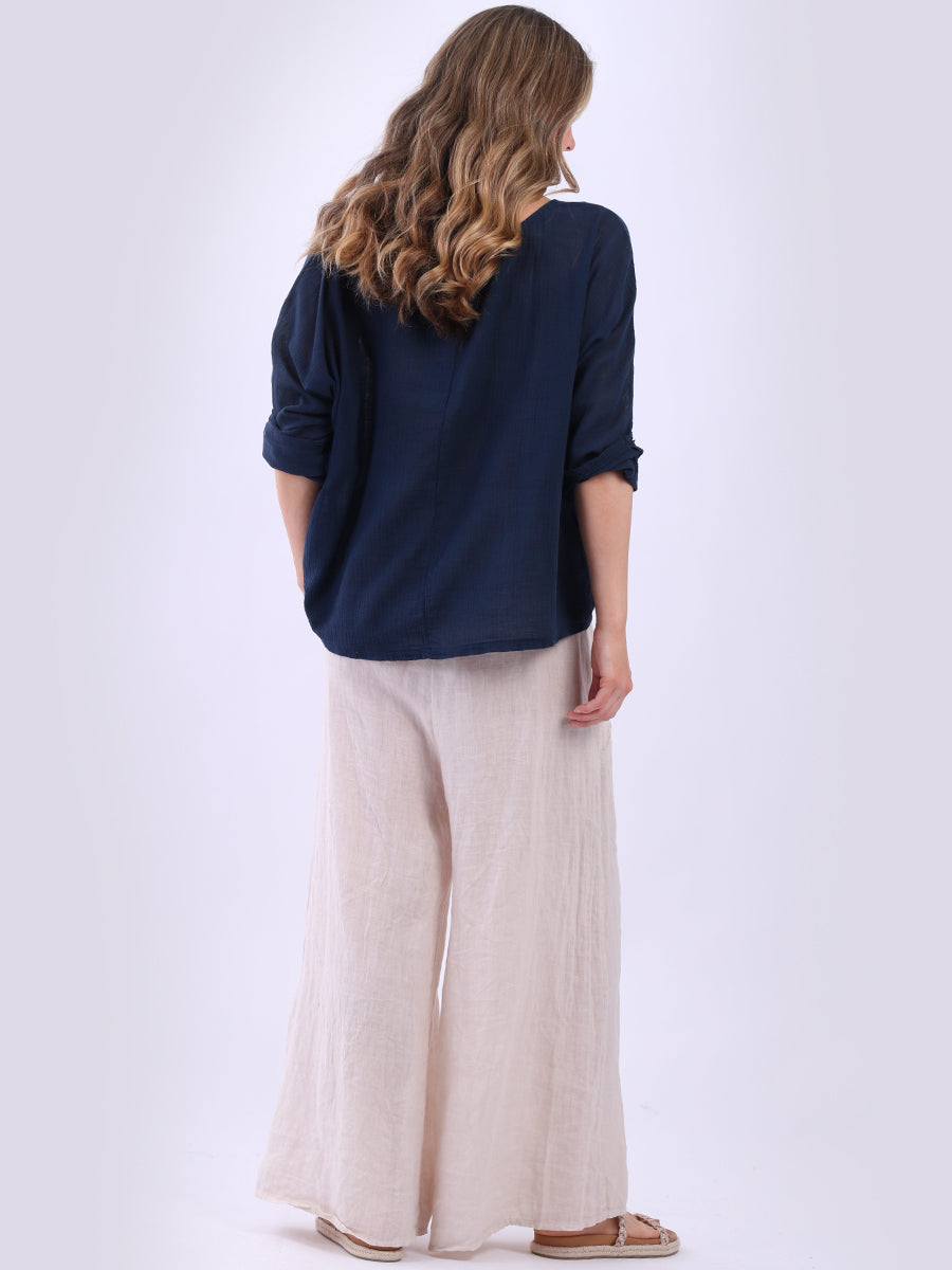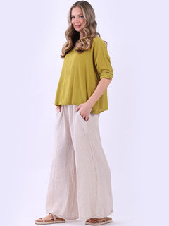 This ladies' plain classy cotton top is exceptional in comfort and wearability, all thanks to its loose fit, rolled sleeves, and round neckline. Its solid hue makes it versatile, pairing well with plain pants, denim jeans, or a cardigan, as you desire.