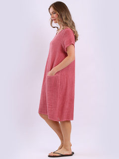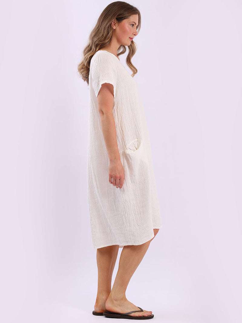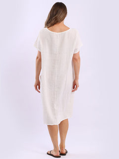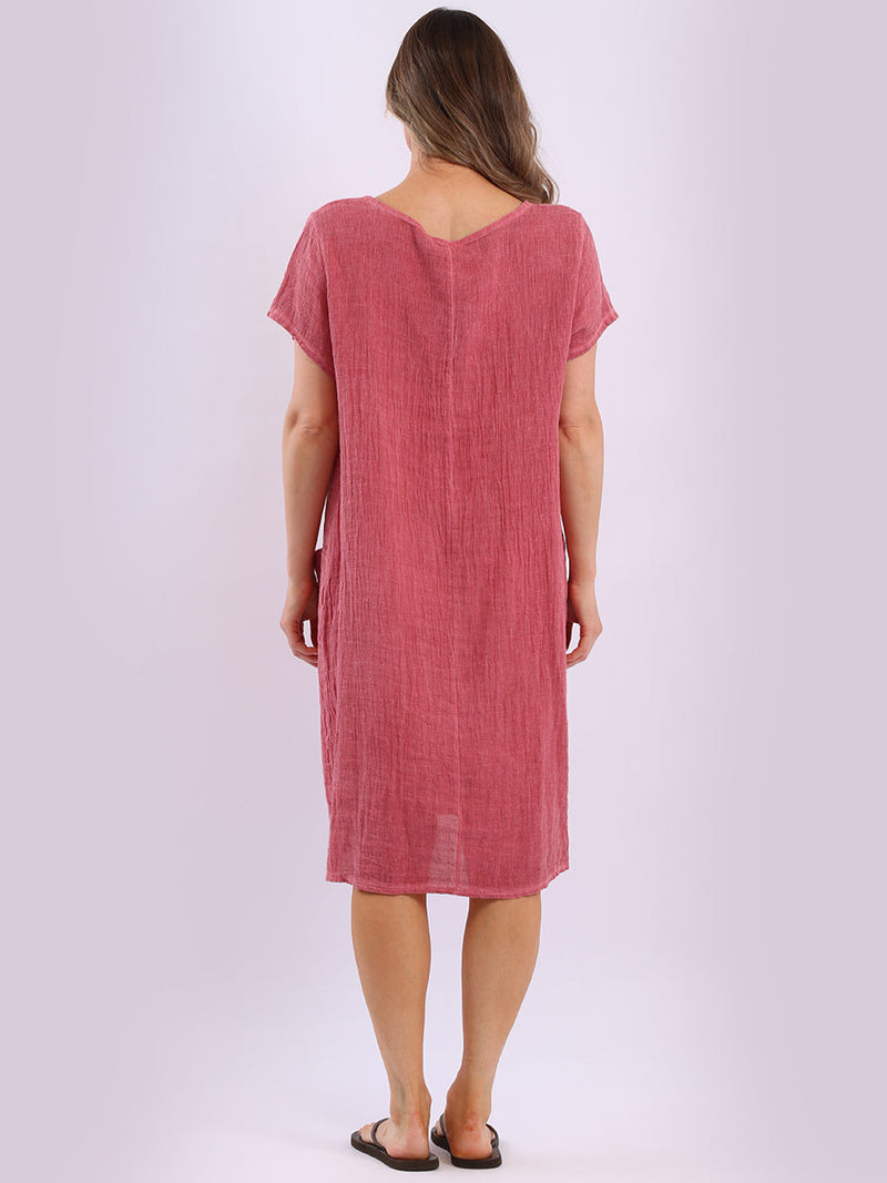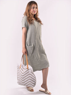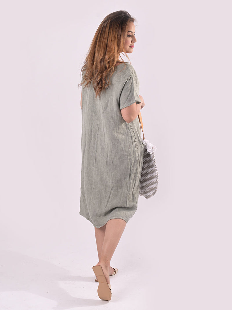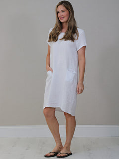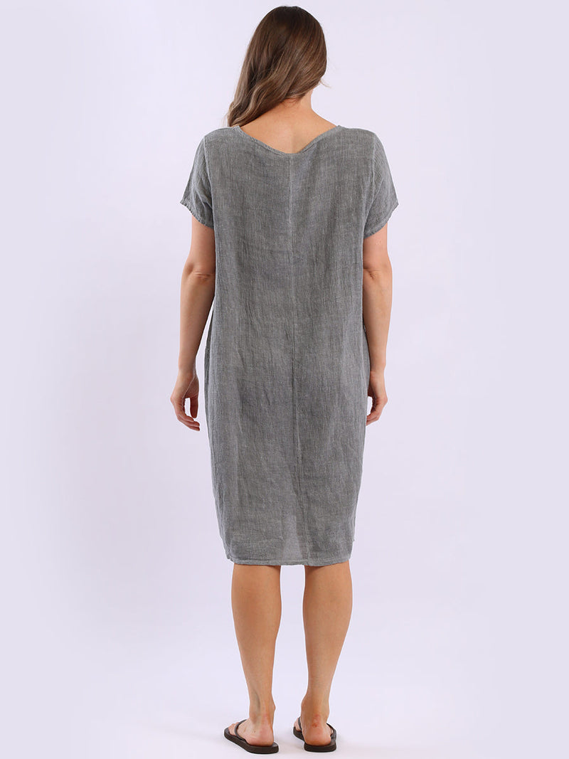 This vintage-washed linen midi dress combines comfort and style with its relaxed fit, soft texture, and breathable fabric. Featuring a curved hemline, short sleeves, side pockets, and a classic round neckline, it's perfect for warm-weather outings and can be effortlessly dressed up or down.