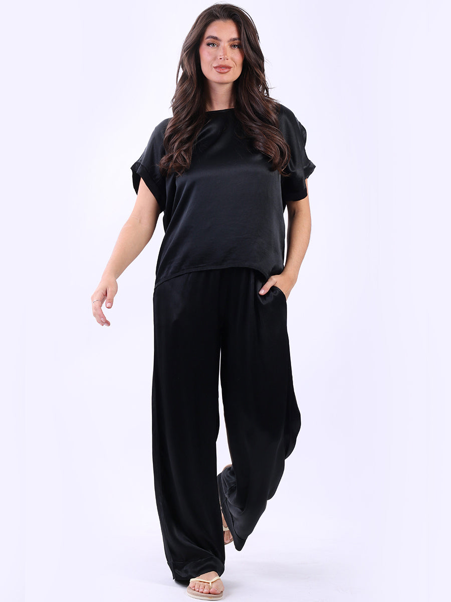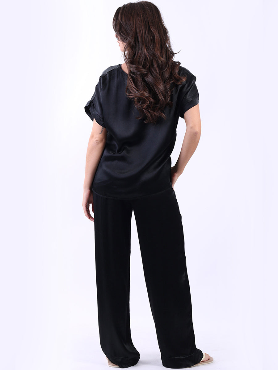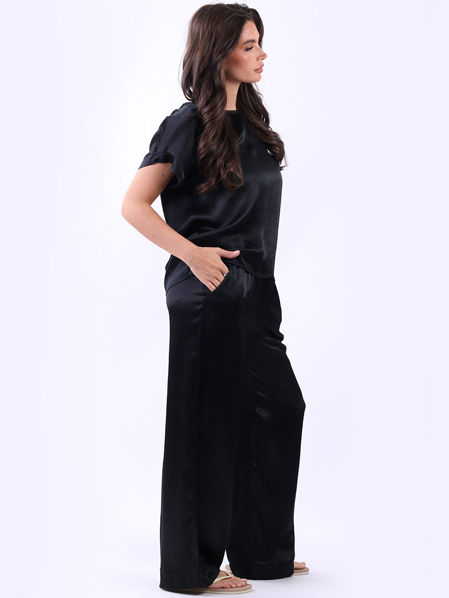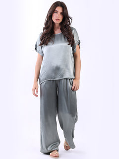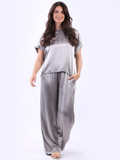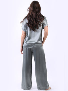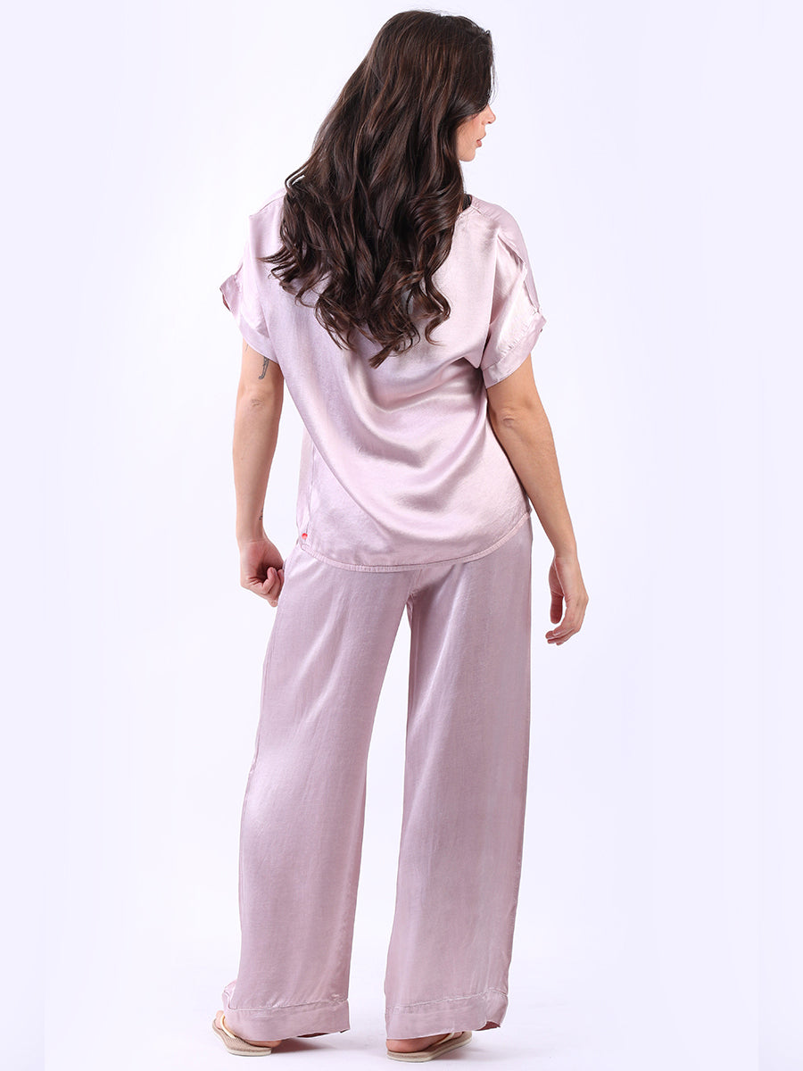 Elevate your loungewear with this made in Italy satin crop top in a soft color hue from Online Women Clothing Boutique. Crafted from silky smooth fabric with a subtle sheen, it features a relaxed fit, rolled short sleeves, and a clean round neckline for effortless elegance. Perfect for pairing with matching satin trousers or styling solo with jeans or skirts, this top brings a touch of luxury to everyday comfort.