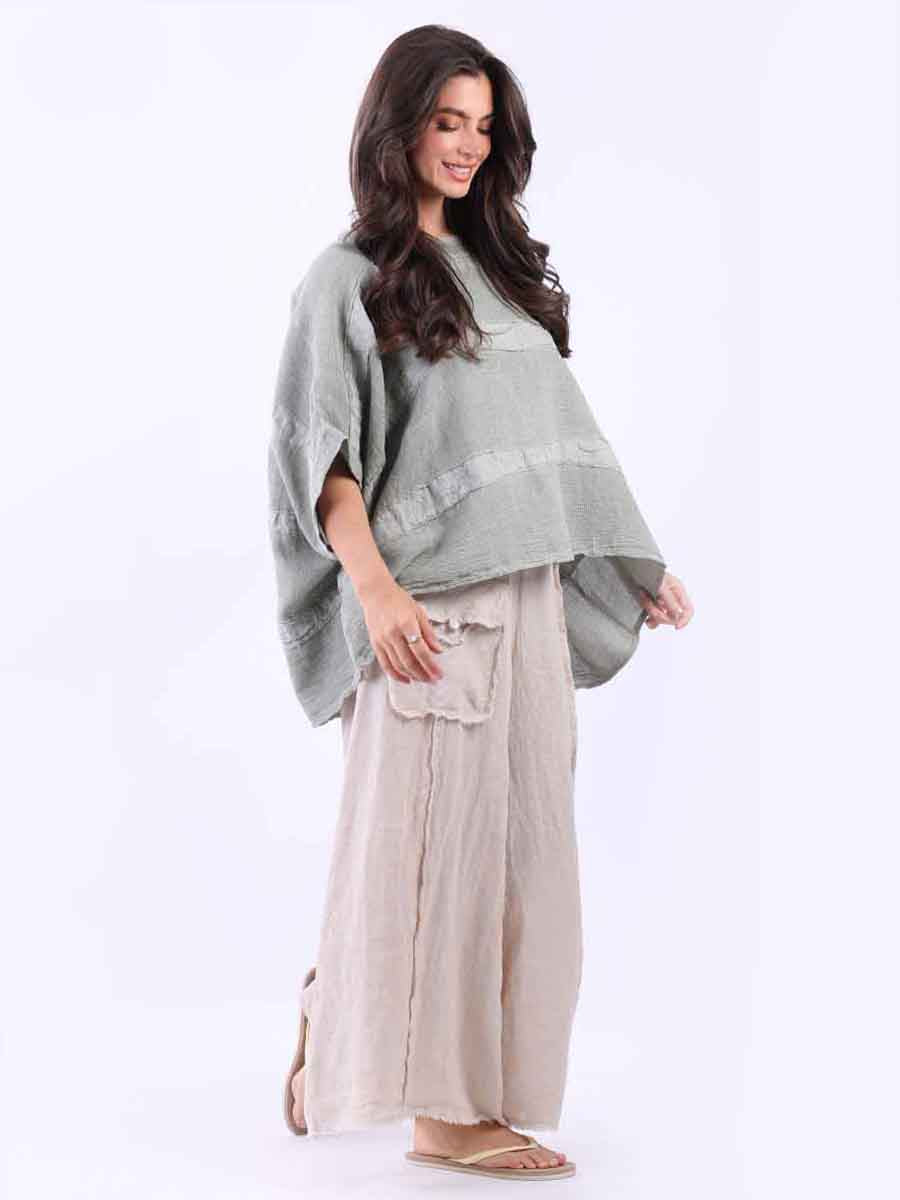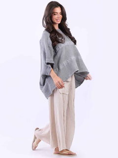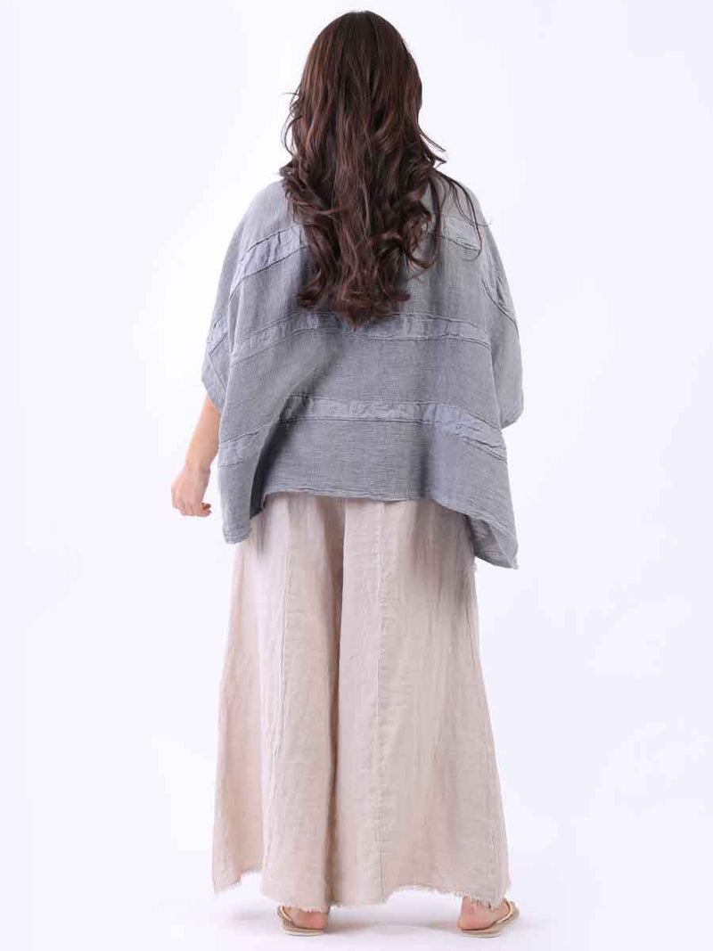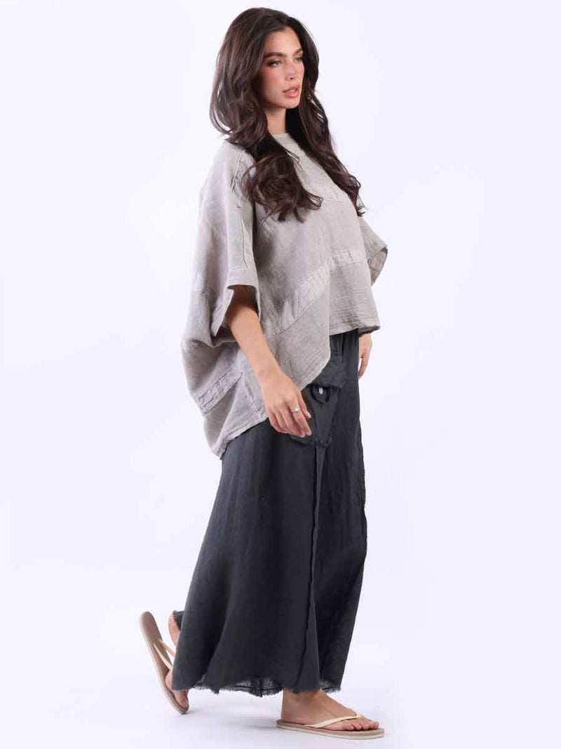 Women can add a playful twist to summer wardrobe with this vintage linen top. Designed with horizontal patch details across the bodice and waist, it brings a funky, fun vibe to your everyday look. Made from soft, breathable linen, this top is part of Fashion Boutique's vibrant summer collection, perfect for staying cool in style. Crafted in Italy for high quality, it features a wide round neckline, oversized baggy fit, half sleeves, and a roomy hem for effortless movement and comfort. Pair it with floral ankle-grazer trousers for a chic statement, or keep it relaxed with linen pants for an easy, breezy outfit.