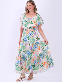 Looking for a vibrant summer dress? Look no further than this made in Italy tropical printed dress introduced by Women Clothing Store featuring a highly demanded off-shoulder design, ruffle trim, and a ruched waist that is flowy and breezy for sunny days. Its skin-friendly fabric and wide flattering hem make it most desired for hot summer wardrobes.