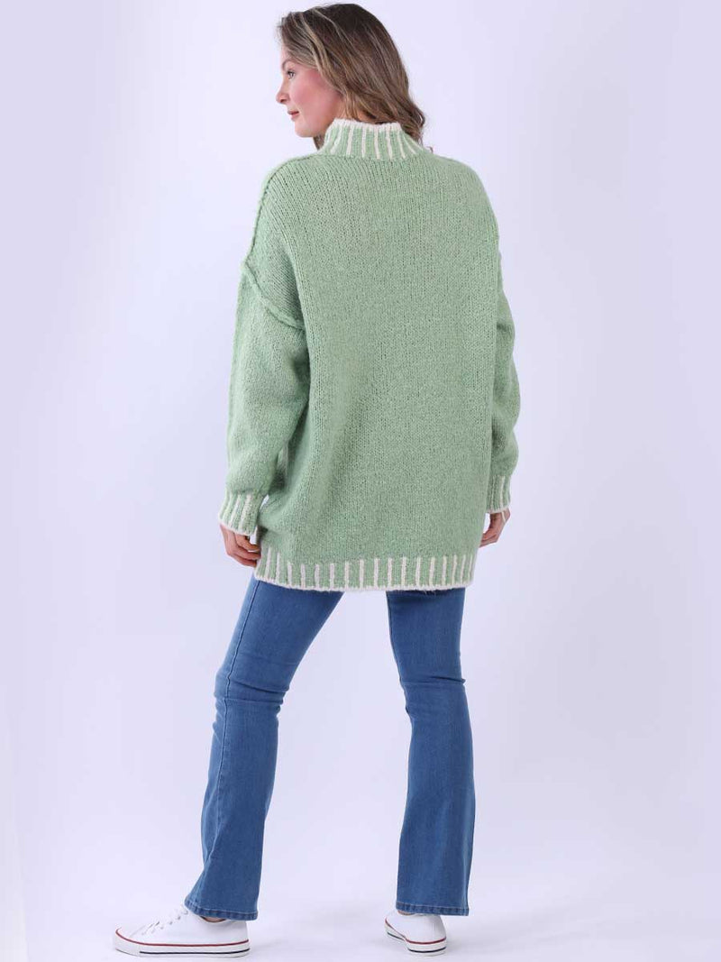 Dreaming of a cocoon of comfort in Italian style? Check out this ladies’ wool jumper knitted with whipstitches. This oversized baggy sweater features a funnel neck and long sleeves, a most desired combo in winter. Whether styled with skinny jeans and long boots or wide-leg pants and loafers, this looks stunning and timeless.