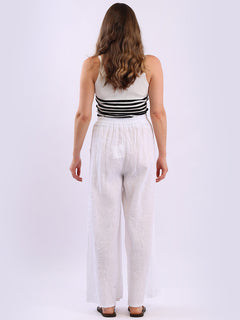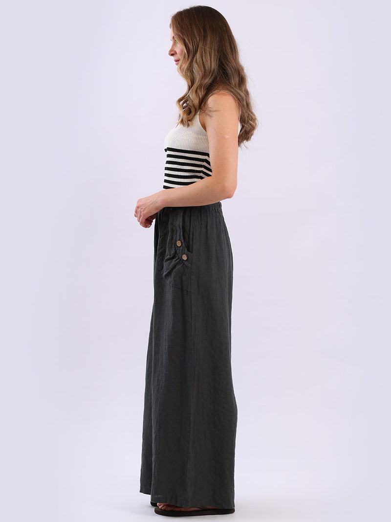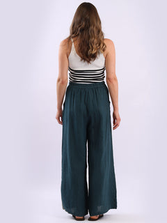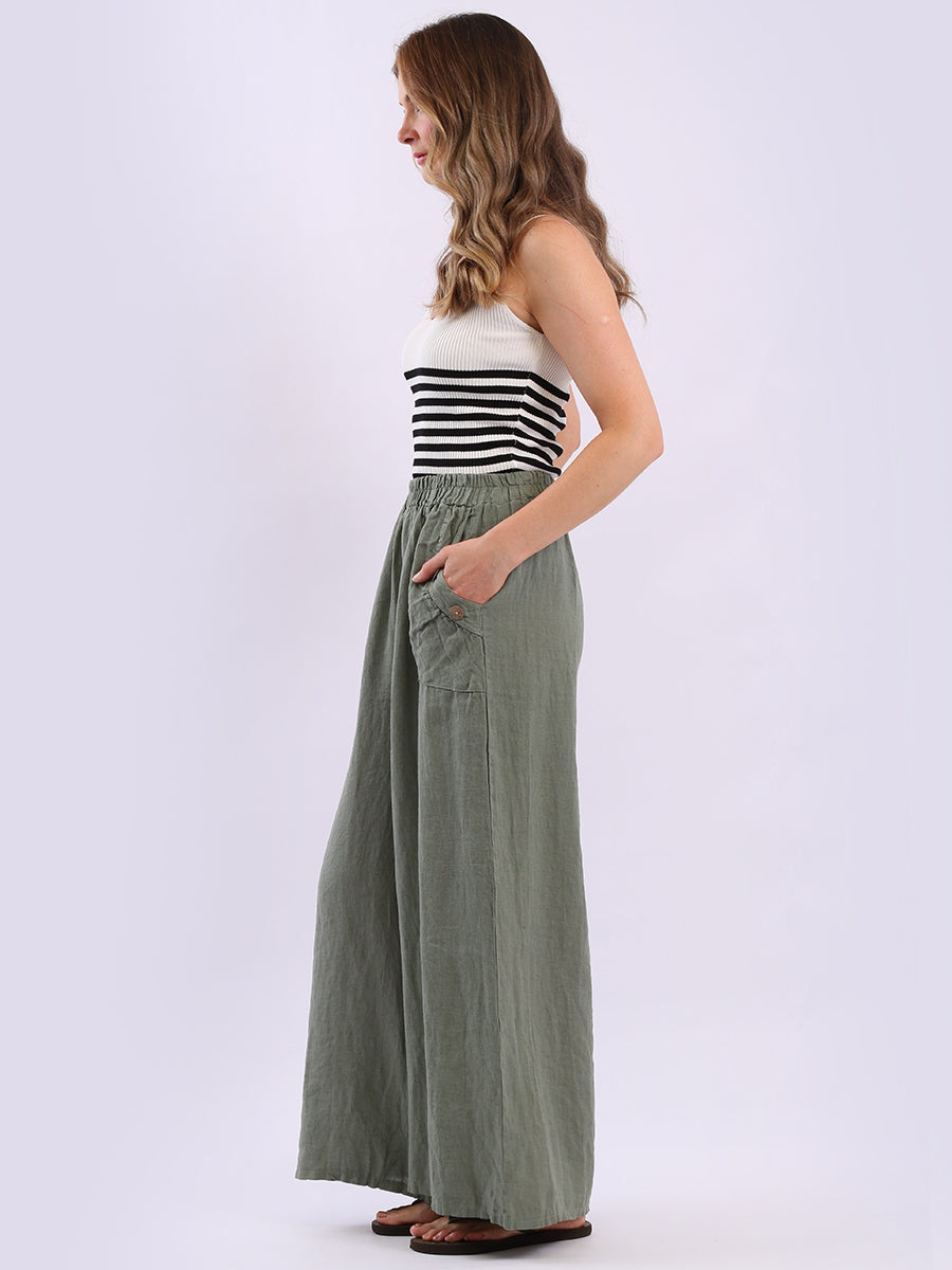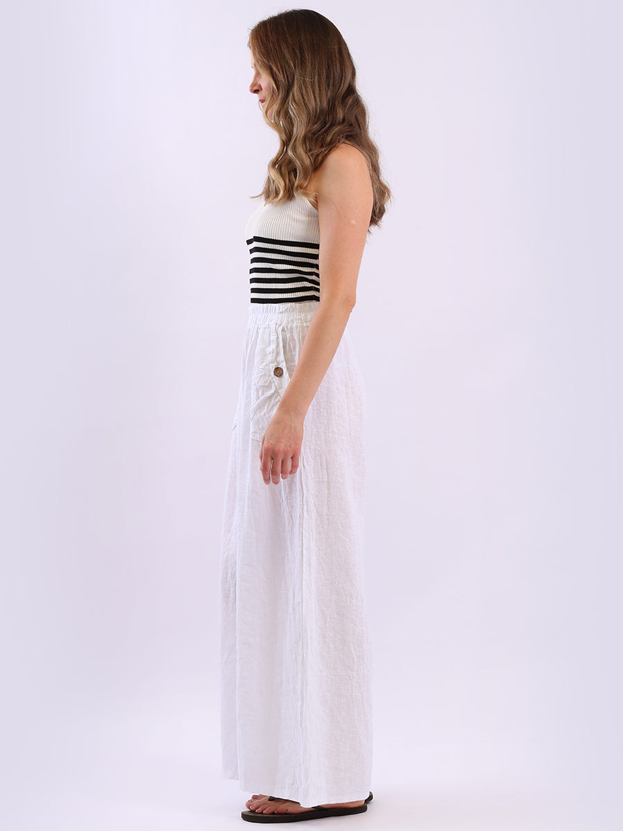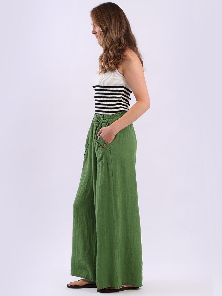 Stay cool and stylish this season with these Made in Italy linen palazzo trousers from Online Clothing Store. Designed for plus-size comfort, they feature a relaxed wide-leg silhouette, elasticated waist with adjustable tie, and charming wooden button detailing on the pockets. Lightweight and breathable, they're perfect for everyday wear, holidays, or casual summer outings.