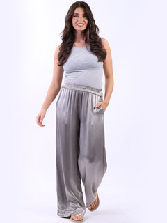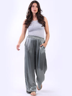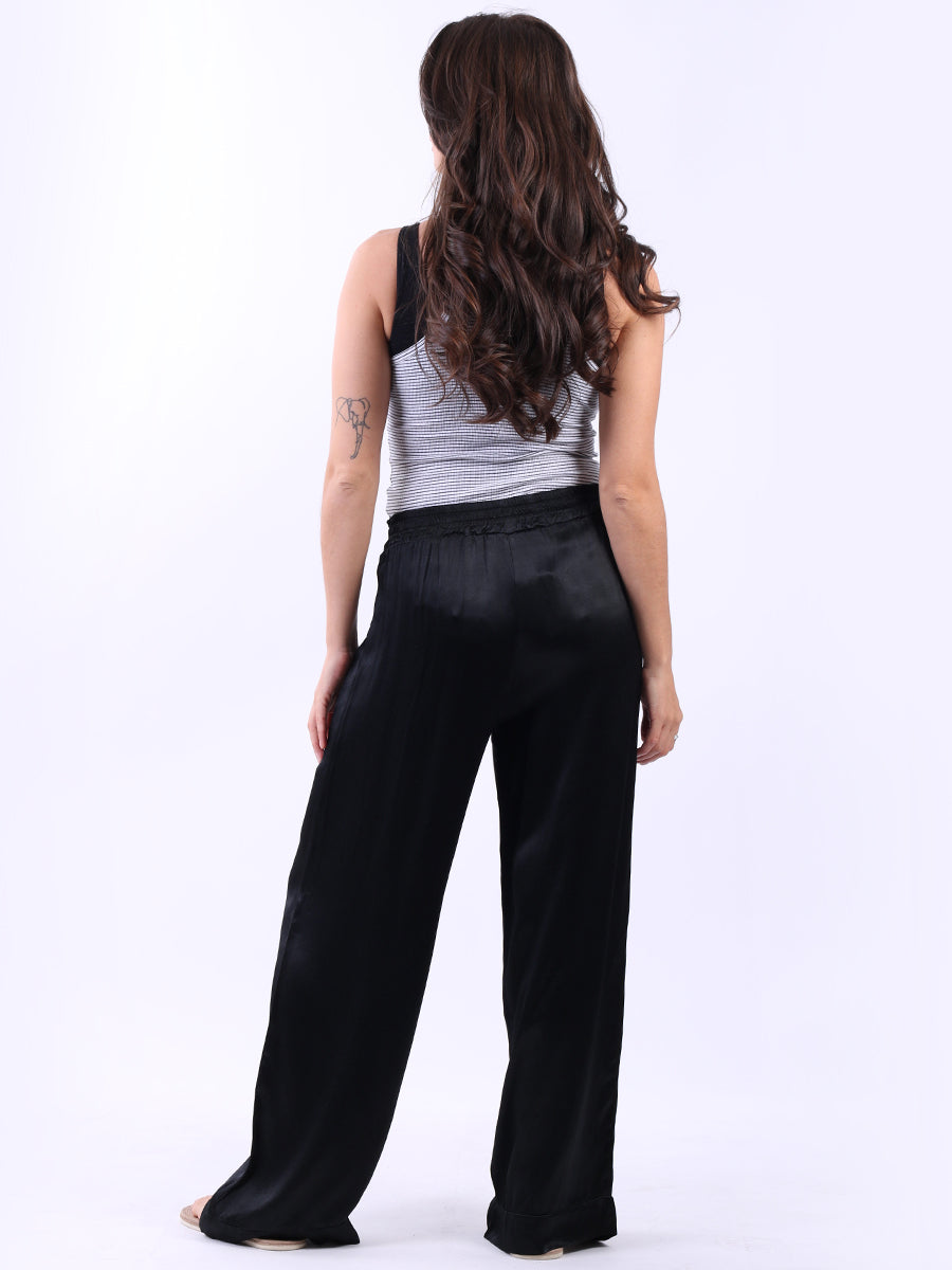 Step into effortless elegance with these made in Italy satin palazzo trousers. These wide-leg trousers feature a flattering high-rise fit with a comfortable elasticated waistband and side pockets for added ease. The fluid silhouette drapes beautifully, making them perfect for both lounging and dressing up. Style with a simple tank or a matching satin top for a chic, coordinated look.