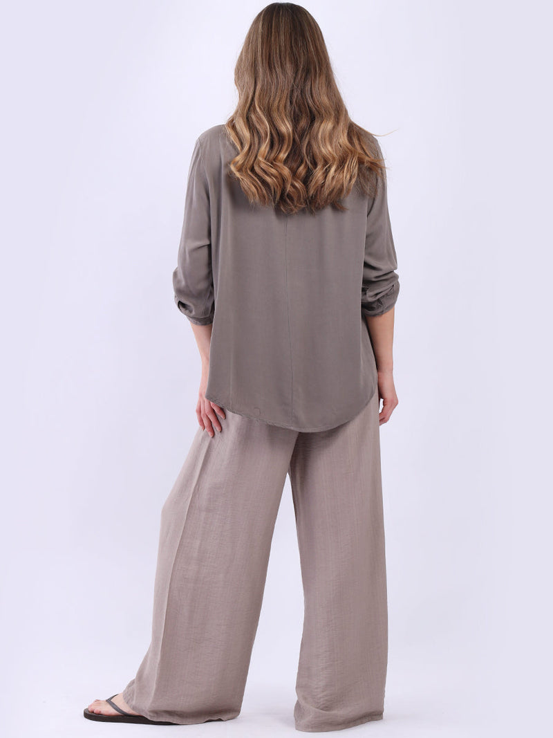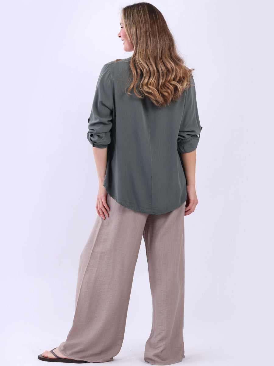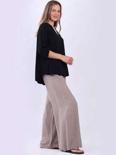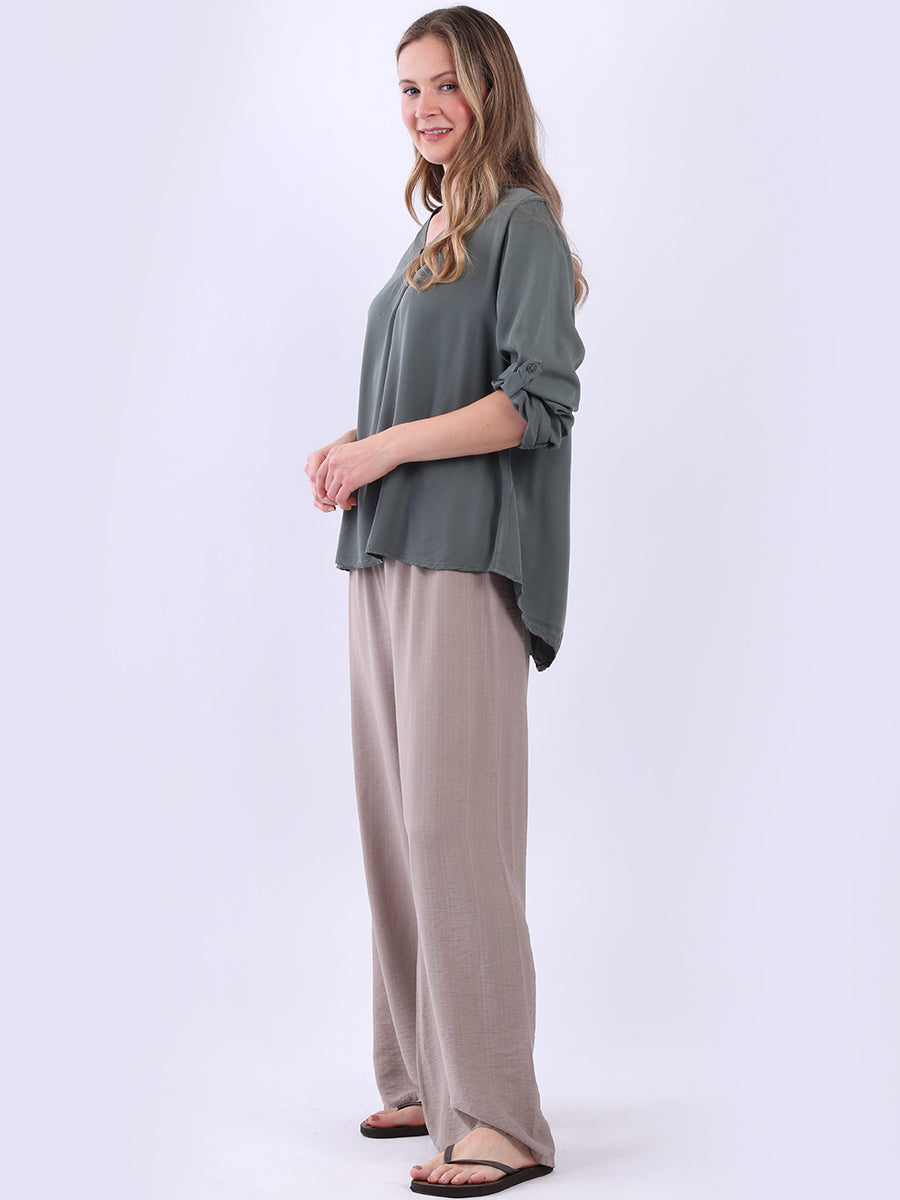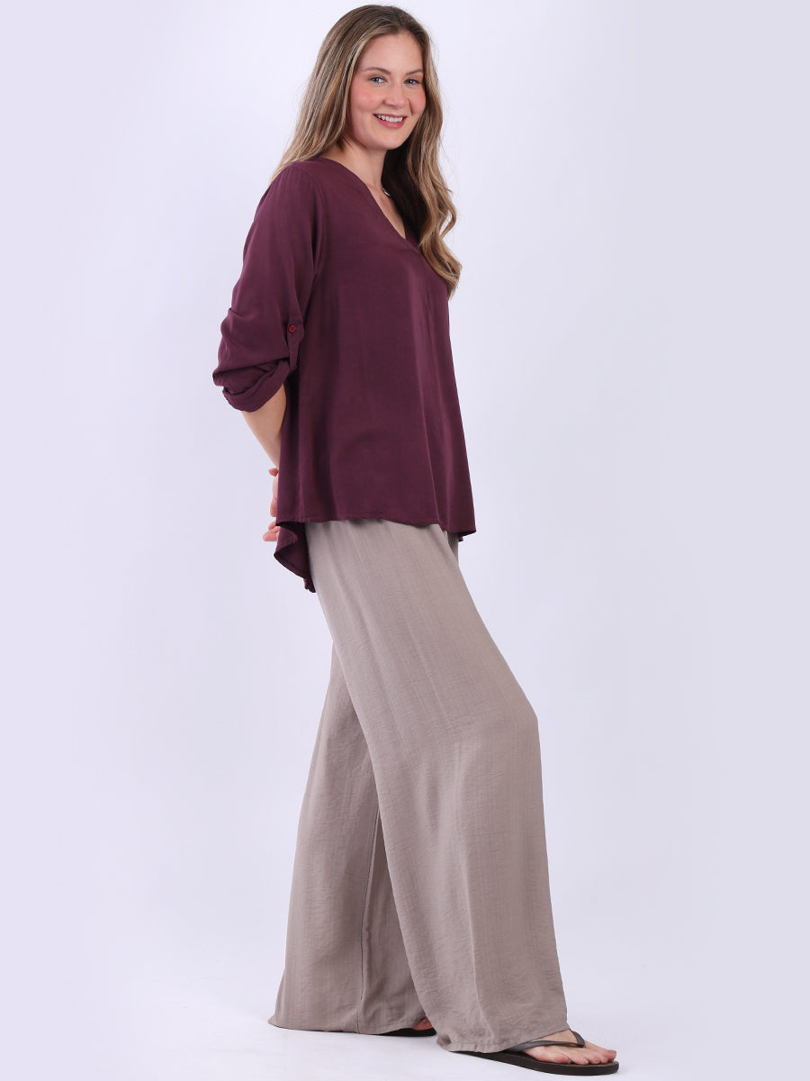 Fashion boutique presents this timelessly elegant baggy crop top that is plain in color and casual in design. Crafted with precision in Italy, this top has all the soft, laid-back features like v neckline, long tabbed sleeves and a loose fit, that a modern woman desire. Pair this stunning top with wide-leg trousers to achieve the classic aesthetics.